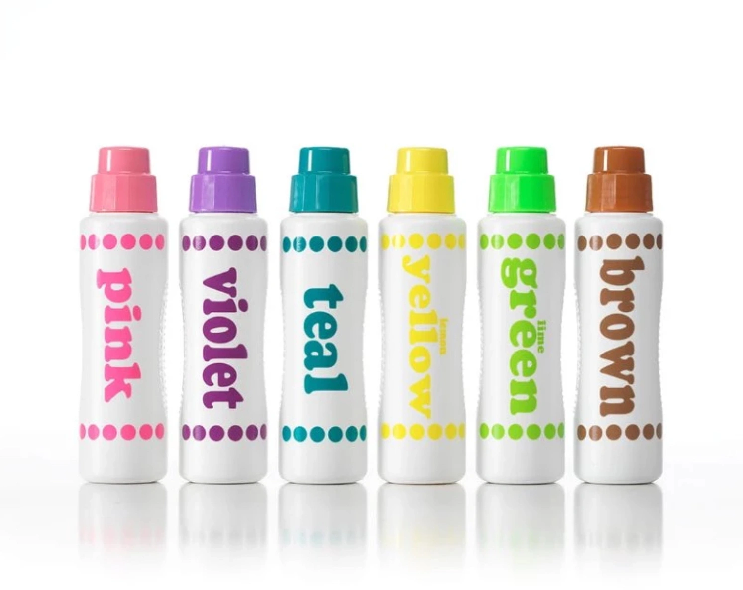 - Każdy marker ma formę dużej, poręcznej butelki dopasowanej do dziecięcych dłoni. Zamiast cienkiej końcówki zastosowano miękką, opatentowaną gąbeczkę, która umożliwia stawianie równych, wyraźnych kropek