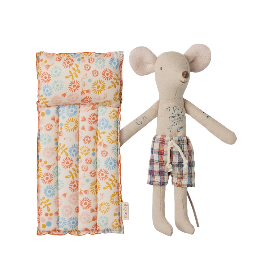 Myszka plażowa z materacem powietrznym, Tata - Kwiatek Ten uroczy zestaw wprowadza klimat wakacyjnego wypoczynku w świecie miniaturowych przygód. W jego skład wchodzi tata mysz ubrany w kraciaste szorty plażowe oraz dopasowany materac z kwiatowym nadrukiem. Znamy potrzeby
