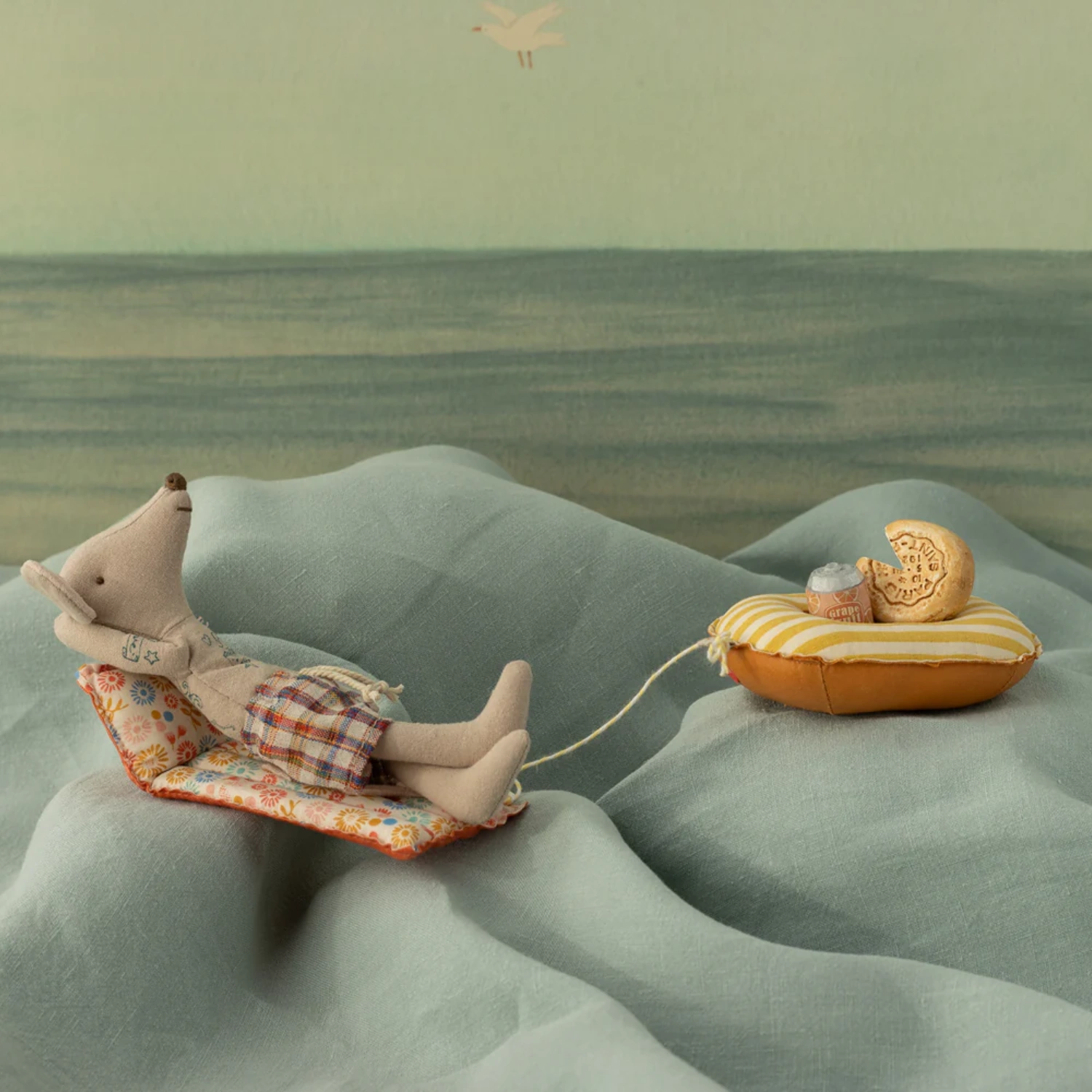 Ten uroczy zestaw wprowadza klimat wakacyjnego wypoczynku w świecie miniaturowych przygód. W jego skład wchodzi tata mysz ubrany w kraciaste szorty plażowe oraz dopasowany materac z kwiatowym nadrukiem , który unosi się na wodzie niczym prawdziwe letnie łóżko do relaksu. Doskonały do zabawy w letnie scenki i historie z życia plażowego.
