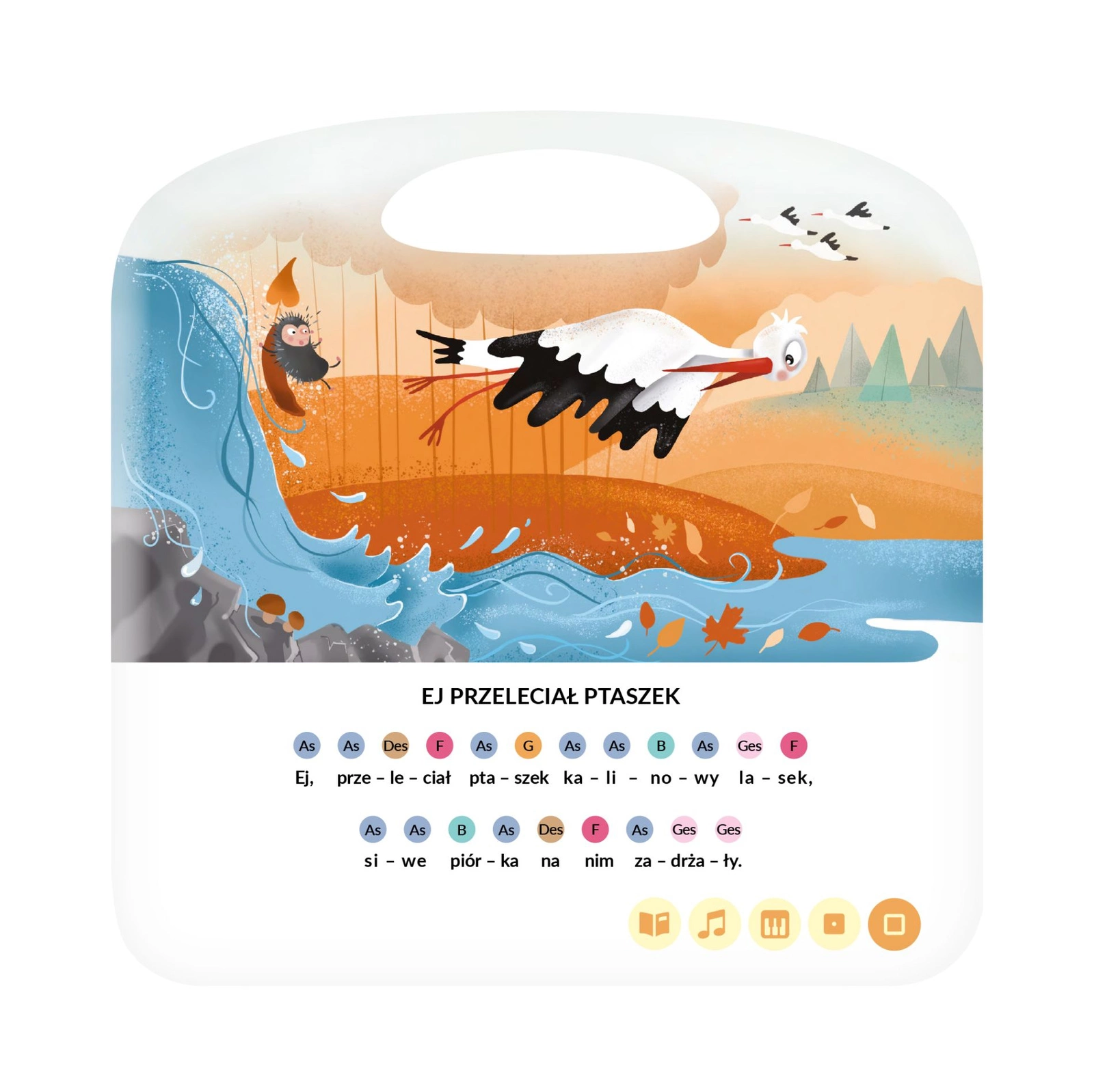 - Wyrusz z Bocianem Bogdanem i Panną Marysią w muzyczną podróż pełną piosenek i zabawy. Każda strona miniksiążki prezentuje inną melodię, fragment zapisu nutowego oraz krótki quiz, pozwalając dzieciom rozwijać słuch muzyczny i spostrzegawczość.