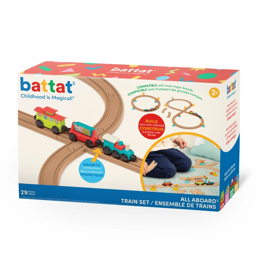 Kolejka z torami All Aboard – 29 elementów, magnetyczne wagony, zabawka dla dzieci 2+