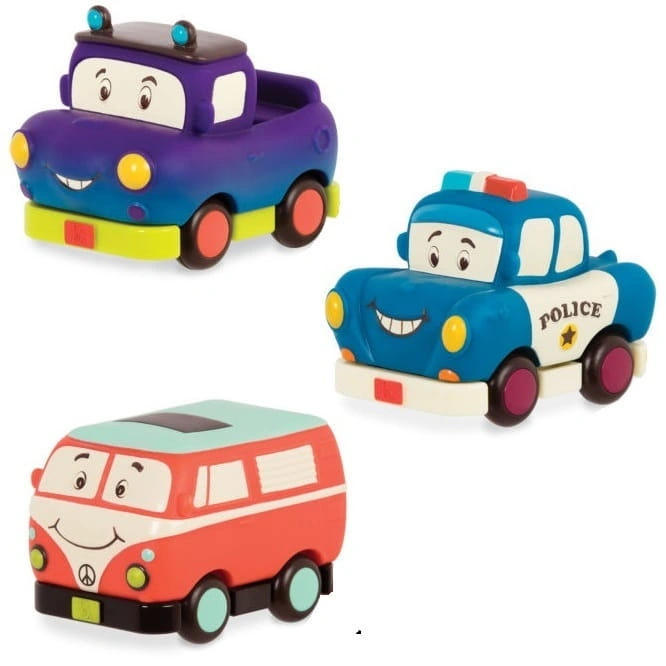 - Zestaw trzech kolorowych samochodzików z napędem typu pull-back – wystarczy pociągnąć je do tyłu, by ruszyły do przodu. Autka są miękkie, bezpieczne i idealne do małych rączek.