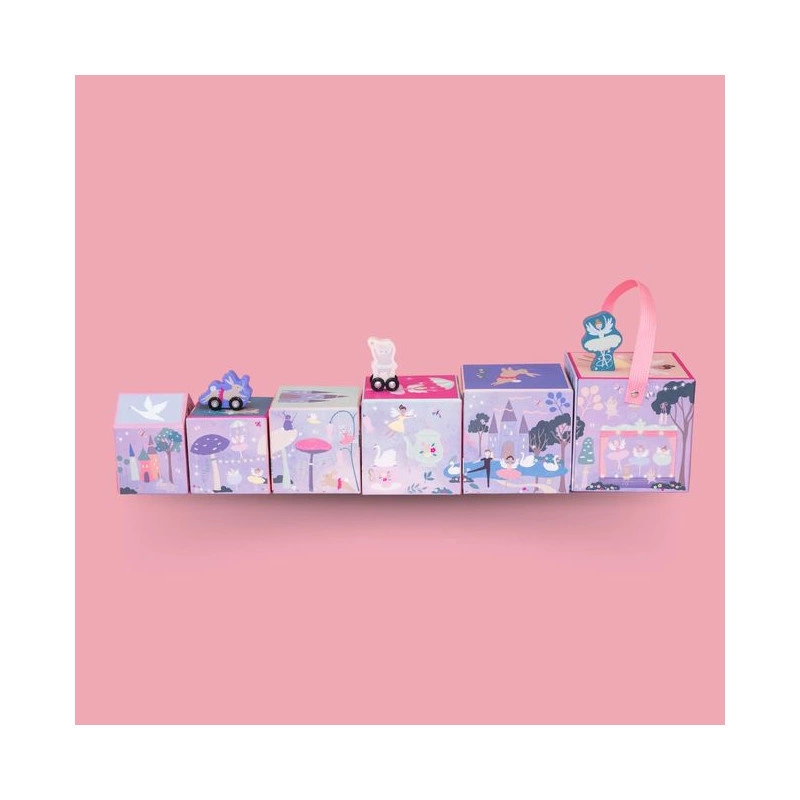 Policz liczby po jednej stronie kostek i dopasuj sceny po drugiej stronie, układając je w odpowiedniej kolejności lub obok siebie. Zestaw zawiera 6 kostek do układania oraz 3 drewniane elementy do zabawy, w tym 2 na kółkach. Wszystkie części są przechowywane w dużym pudełku z poręcznym uchwytem, co ułatwia zabranie zabawy wszędzie tam, gdzie chcesz!