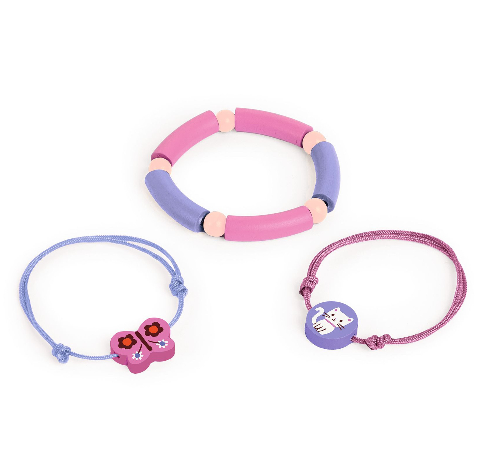 Dwie bransoletki na sznurku mają regulowany rozmiar od 10 do 18 cm, a trzecia wykonana jest z drewnianych koralików, co dodaje zestawowi naturalnego uroku.
