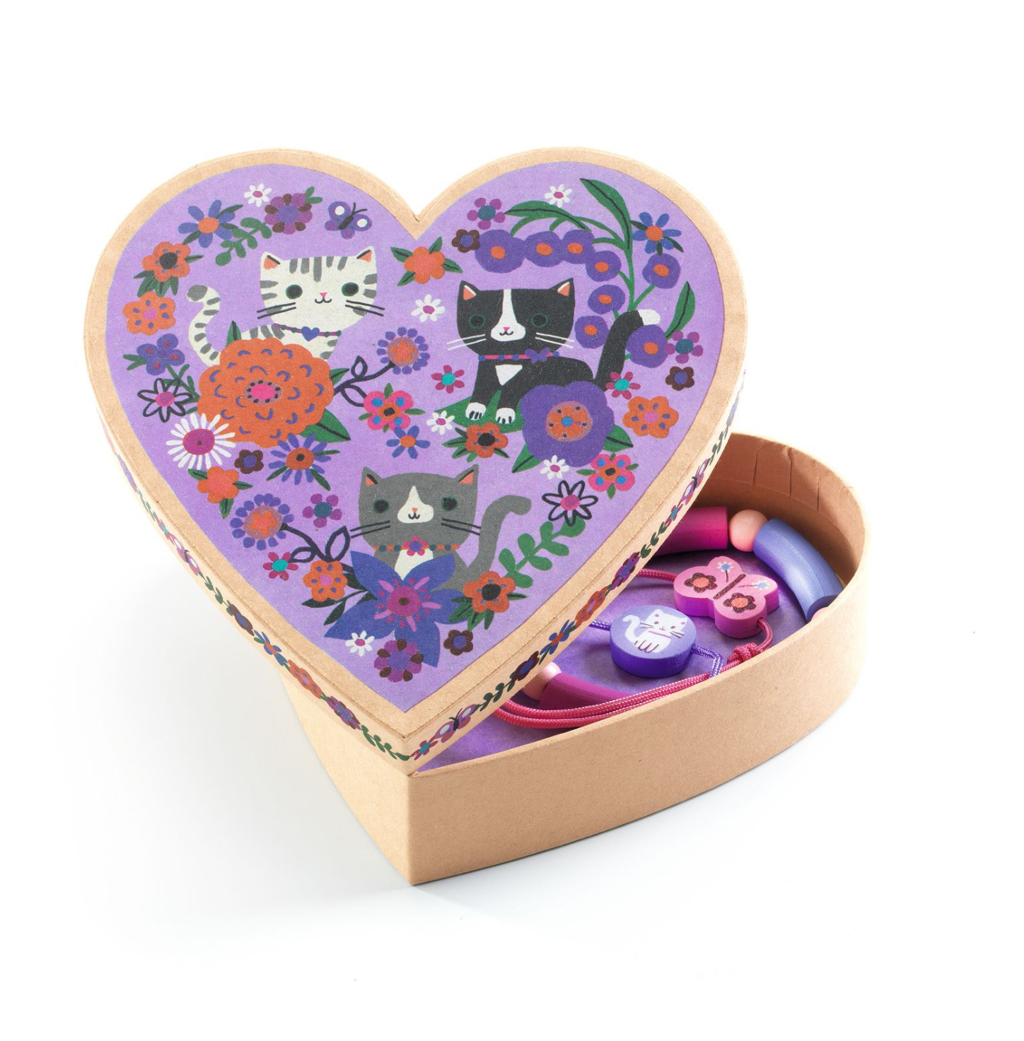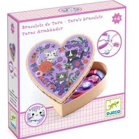 - Prześliczne pudełko w kształcie serca, ozdobione uroczymi kotkami, to prawdziwa skrzynia skarbów dla małych miłośniczek biżuterii. W środku znajdują się trzy bransoletki, które pozwalają na zabawę modą i rozwijanie kreatywności.