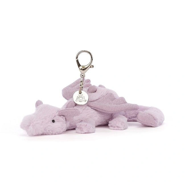 - JellyCat – Breloczek Smok Lawendowy 22 cm Uroczy i mięciutki breloczek w kształcie lawendowego smoka z eleganckim srebrnym medalikiem i praktyczną zawieszką.