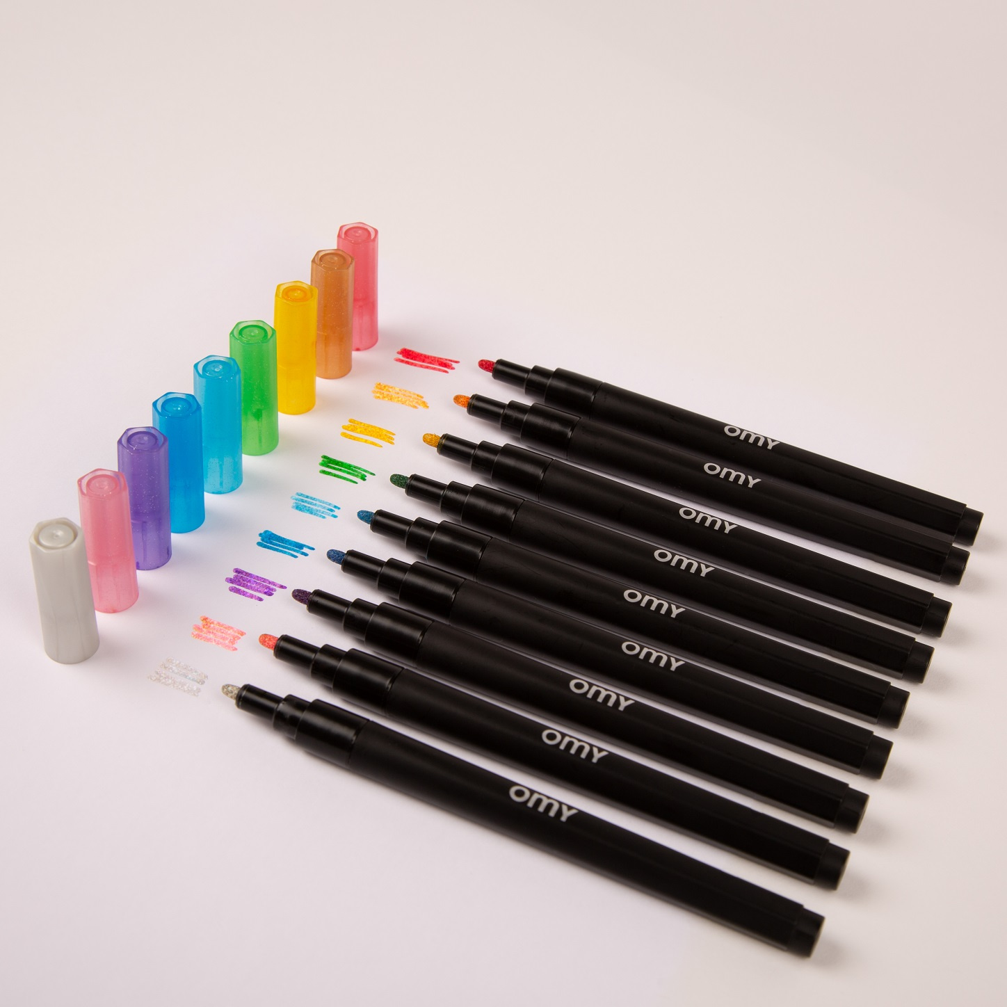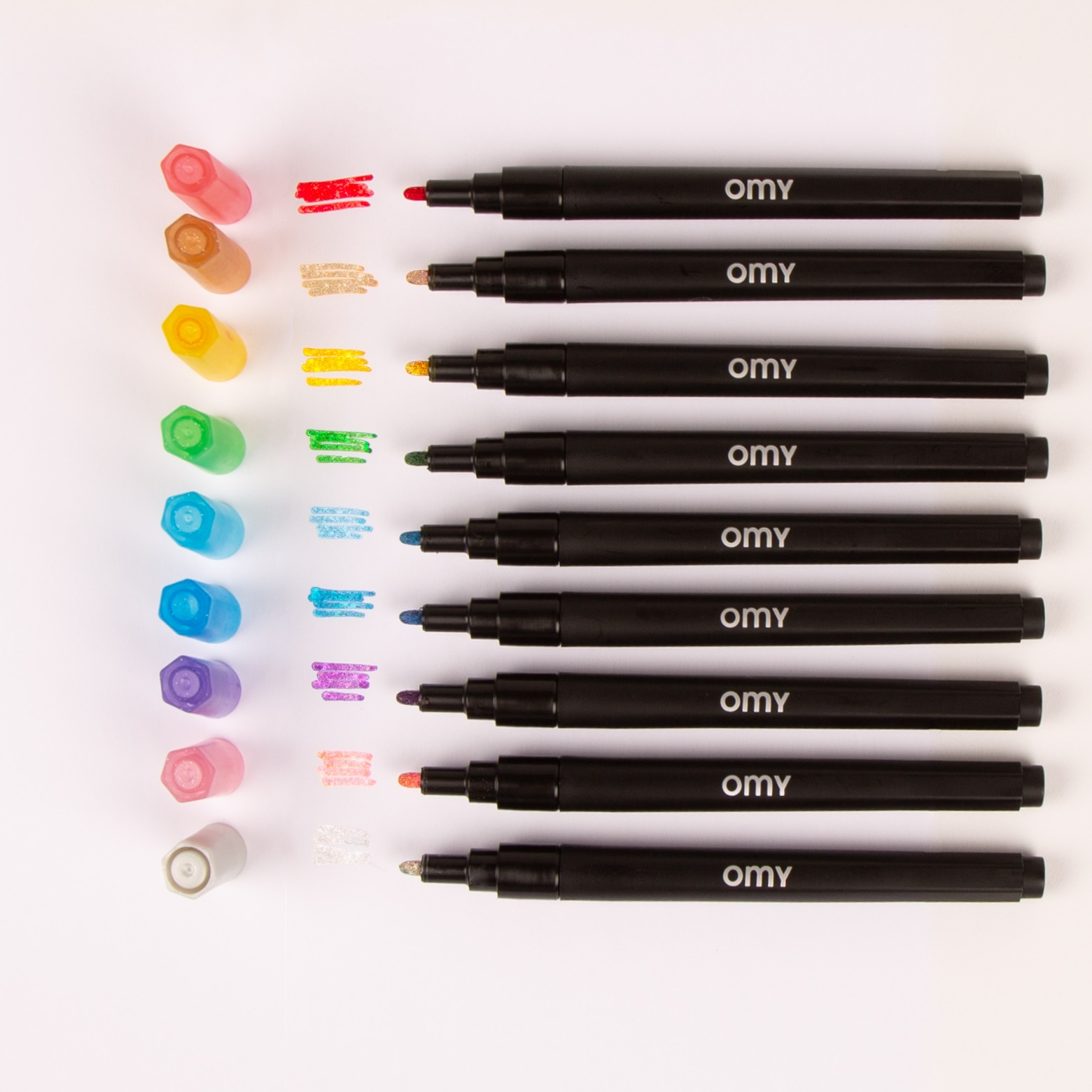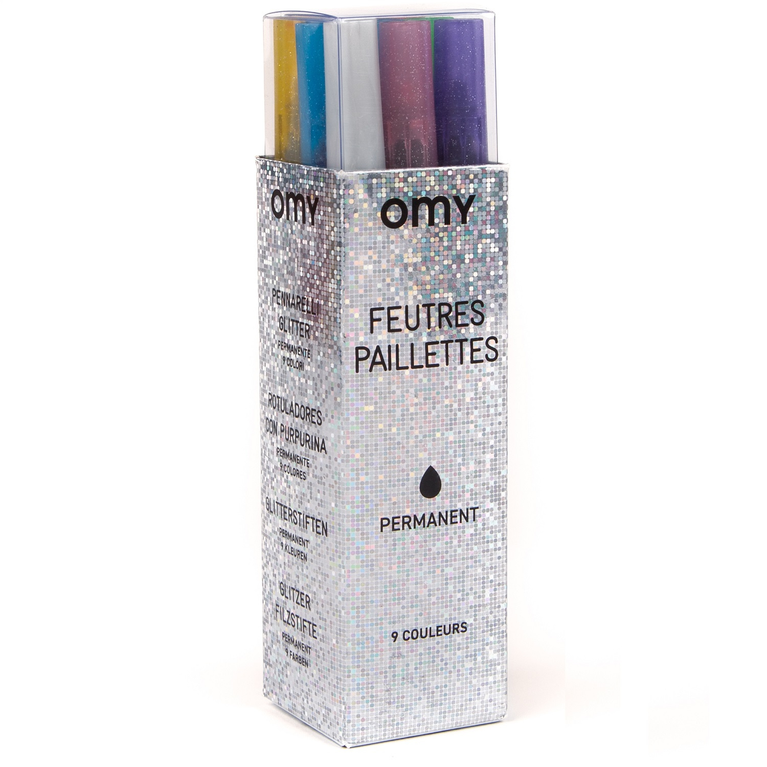 - Zestaw 9 brokatowych flamastrów OMY to doskonałe narzędzie do tworzenia wyjątkowych dzieł sztuki na różnych powierzchniach. Zapakowane w ozdobne pudełko, idealne na prezent i do zabawy.