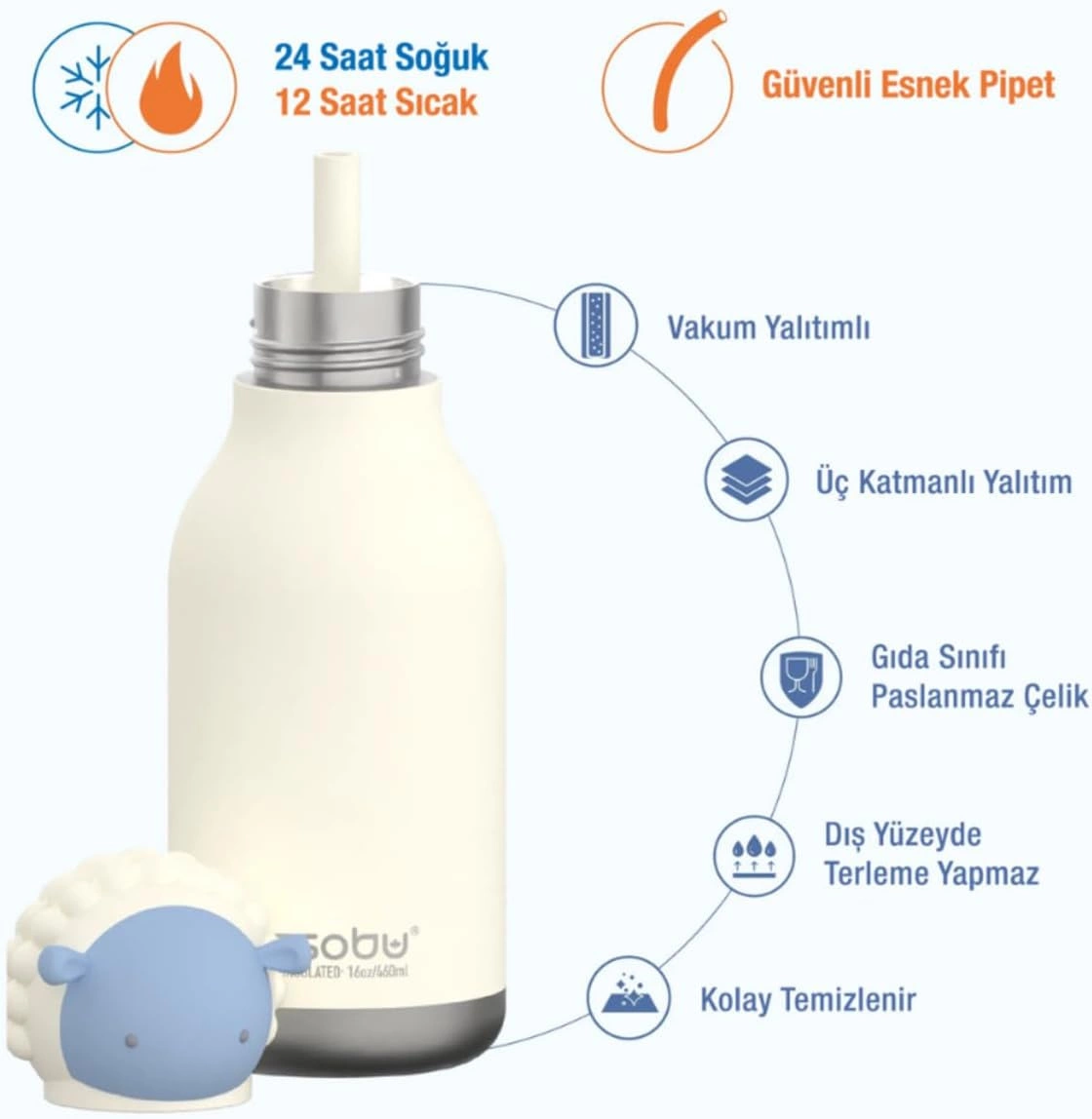 Podwójne Picie: Butelka oferuje dwa sposoby użytkowania: elastyczną, wyjmowaną słomkę wielokrotnego użytku (idealną do zimnych napojów) oraz standardowy ustnik do picia bezpośredniego, dedykowany do gorących płynów.