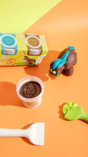 Zestaw zawiera cztery kubeczki ciastoliny w intensywnych kolorach: brązowym, niebieskim, pomarańczowym i zielonym. Opakowanie z papieru nie tylko chroni produkt, ale po rozłożeniu zmienia się w kartę z kreatywnymi zadaniami plastycznymi, które inspirują do zabawy – od tworzenia jaj dinozaura po magiczny róg jednorożca.