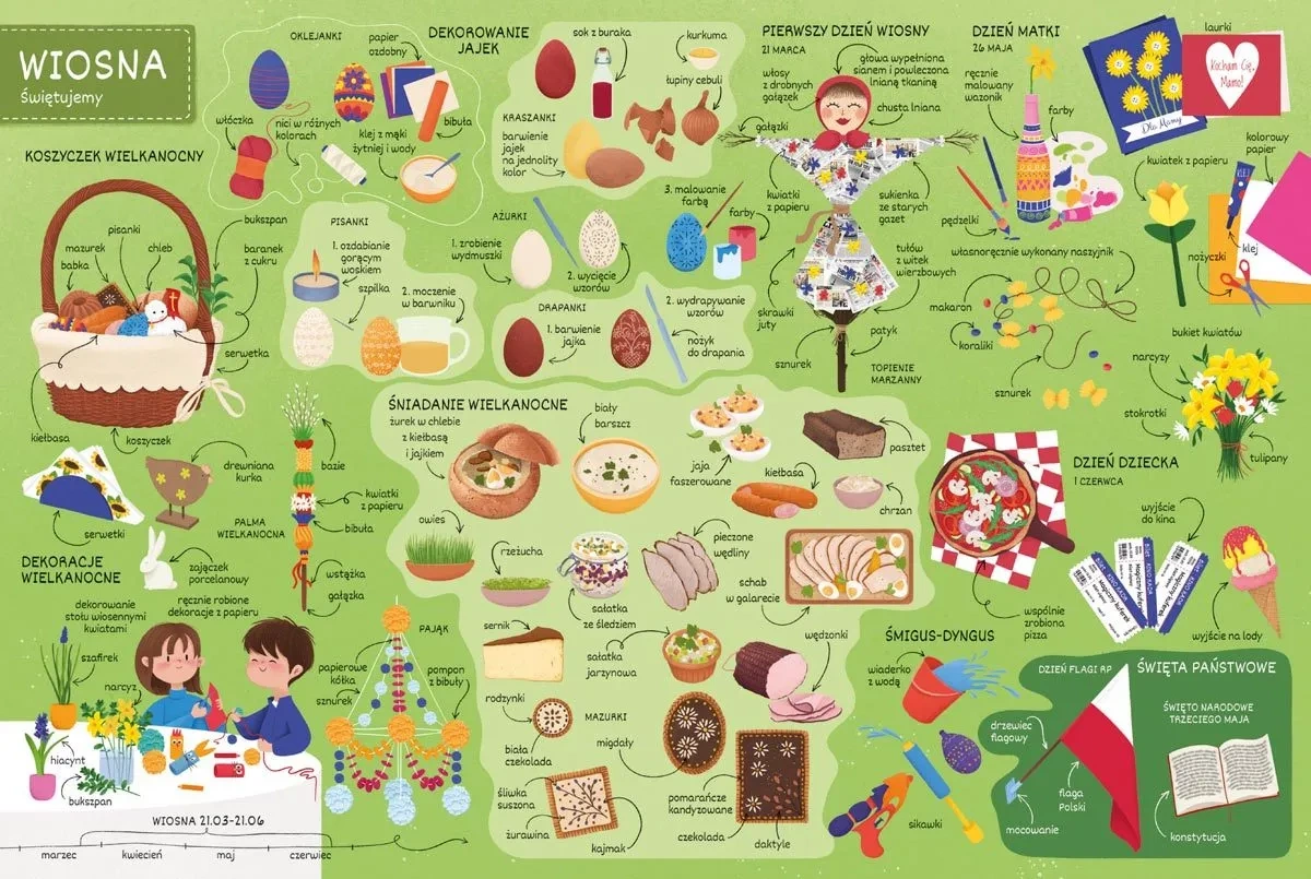 - Ilustrowana książka o porach roku, ich przyrodzie, tradycjach i aktywnościach ludzi. Zawiera przegląd świąt, typowych ubrań i ulubionego Bożego Narodzenia. Pełna szczegółów do wielokrotnego odkrywania!