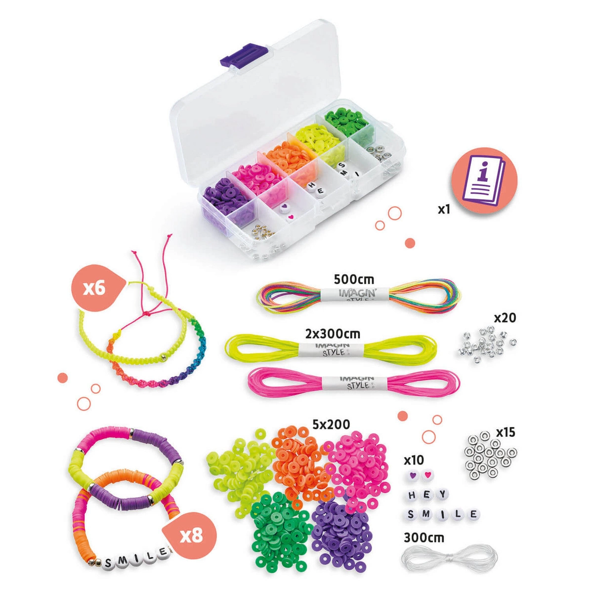 - Odkryj świat ręcznie robionej biżuterii z wyjątkowym zestawem, który pozwala wykonać aż szesnaście unikalnych bransoletek w intensywnych, neonowych barwach.
