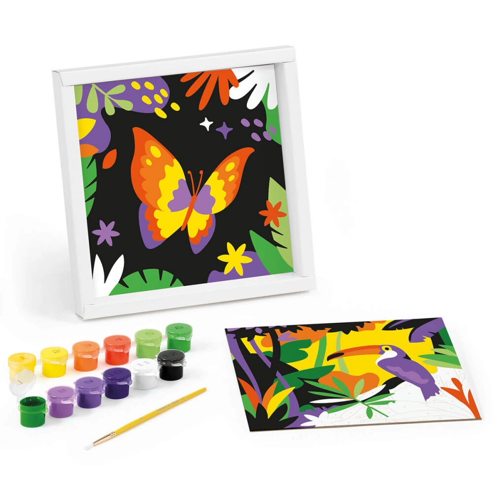 Zestaw kreatywny z kolorowymi motywami papugi i motyla, idealny dla początkujących artystów, którzy stawiają pierwsze kroki w świecie malarstwa.