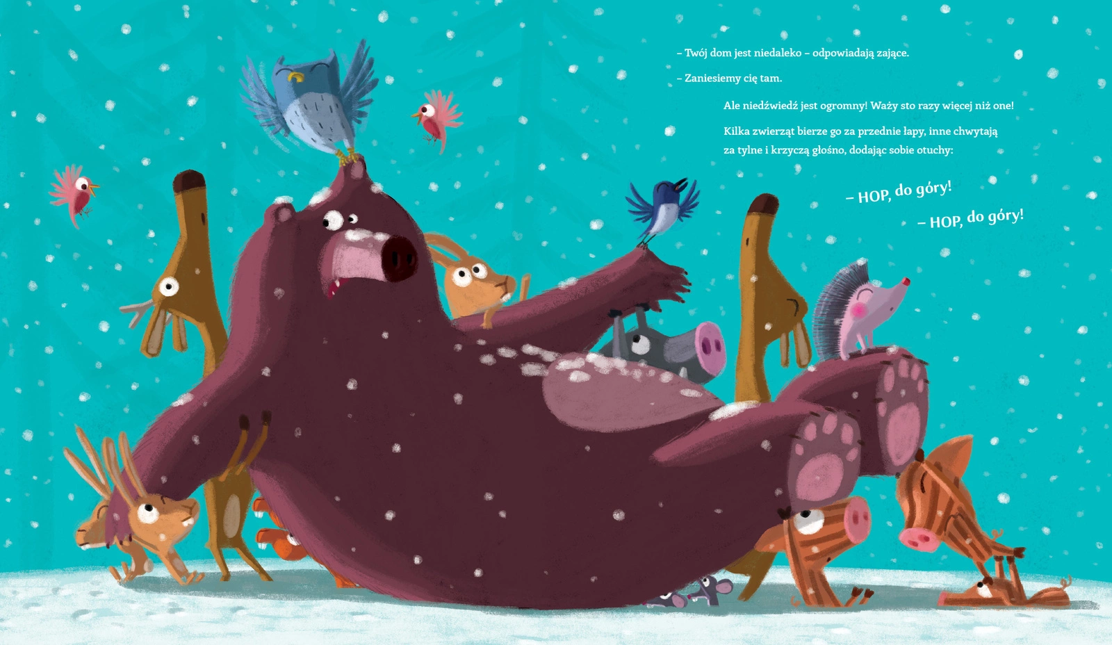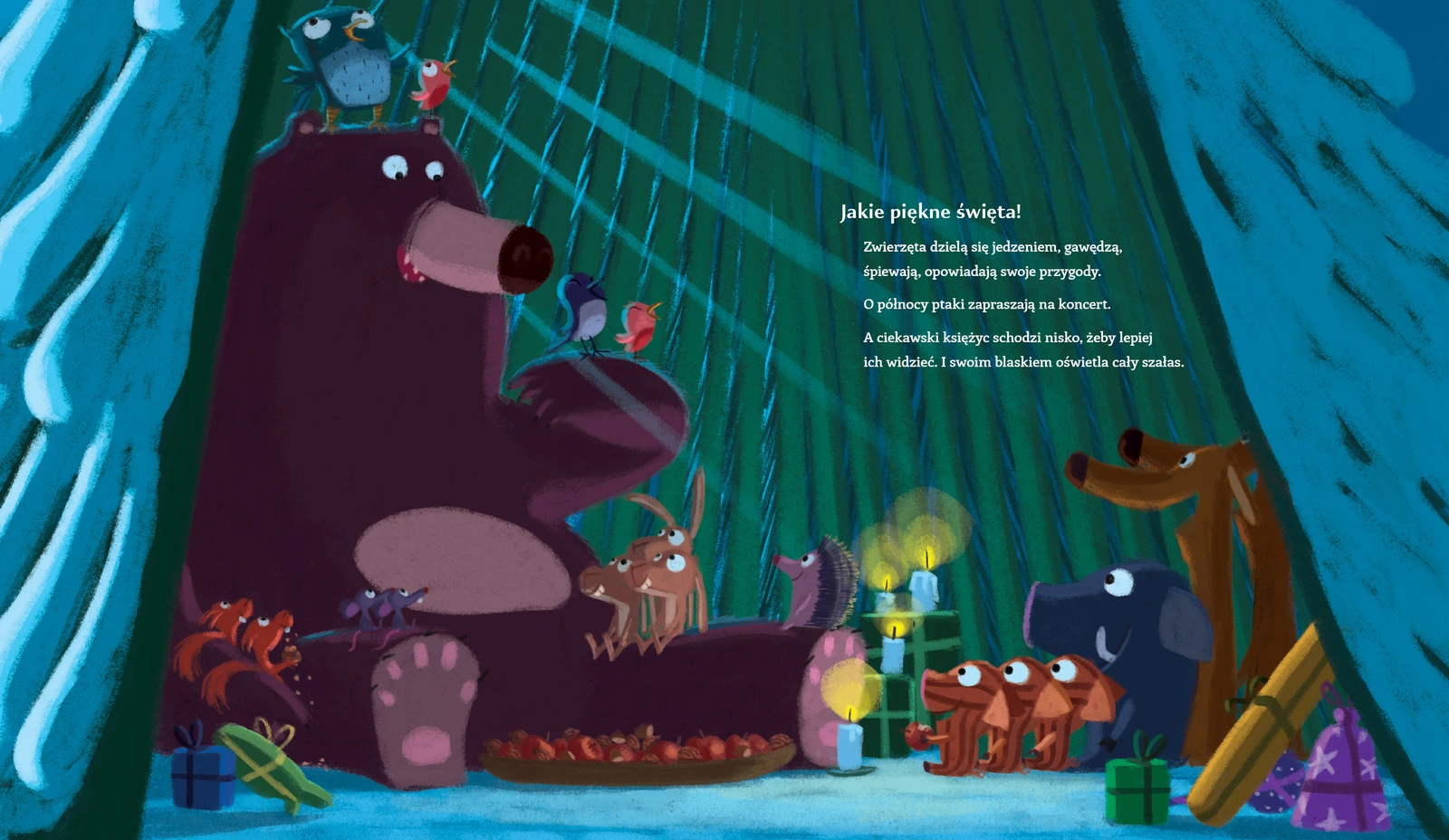 Nie poddają się jednak — zamiast tego wymyślają coś zupełnie innego. Wspólnie stawiają przytulny szałas, dekorują go jak prawdziwy świąteczny dom i przynoszą niedźwiedziowi same pyszności. Tak właśnie zwierzęta spędzają swoją Wigilię: razem, w atmosferze serdeczności, troski i wzajemnego wsparcia.