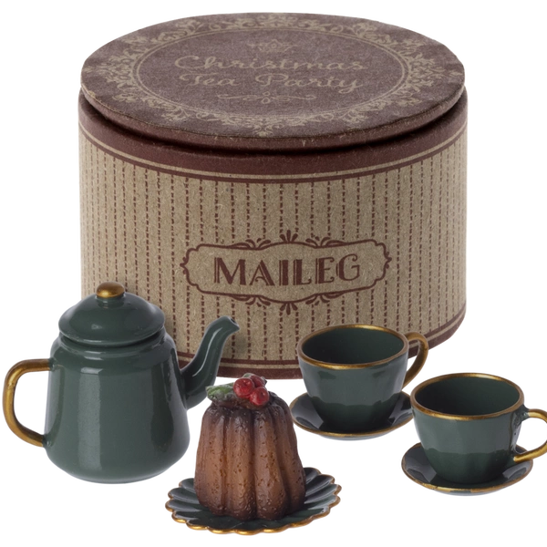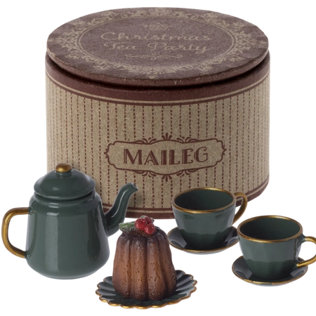 - "Christmas Tea Party" to miniaturowy zestaw herbaciany dla myszy Maileg, zawierający dzbanek, filiżanki, talerzyk i ciasto z żywicy. Wysokość: 4 cm, waga: 0,06 kg. Idealny na świąteczne przyjęcia.