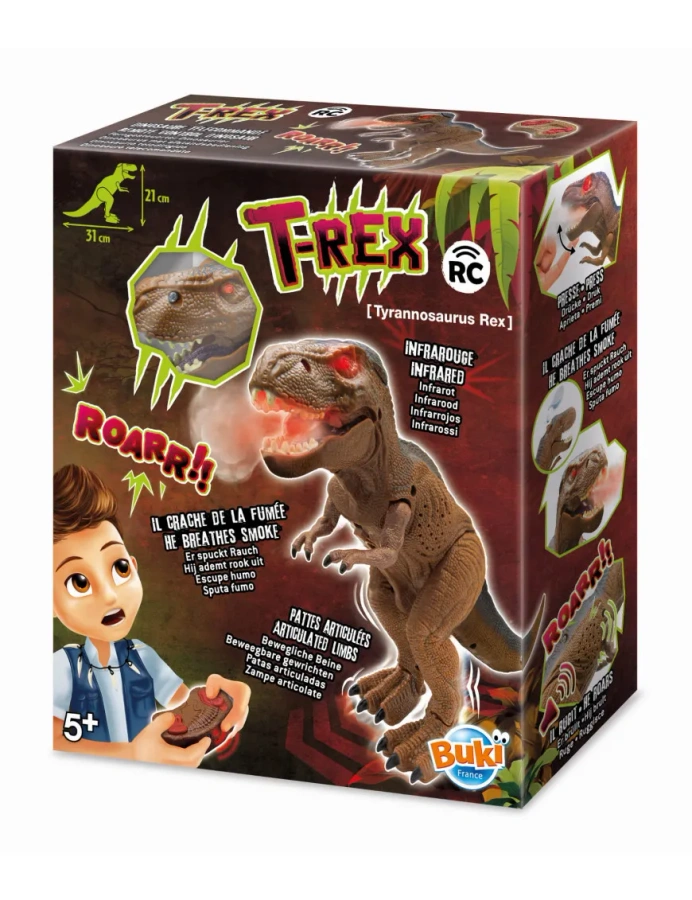 - Zdalnie sterowany T-rex Roarrrr! Ogromny T-rex porusza nogami, powoli przesuwa się do przodu, a jego oczy świecą na czerwono.
