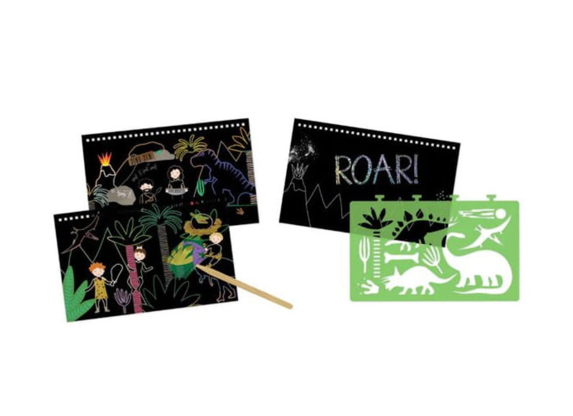 - Wejdź do prehistorycznego świata z kreatywnym zestawem zdrapywanek z motywem dinozaurów! Za pomocą dołączonego drewnianego rysika dzieci mogą zdzierać czarną warstwę farby z kart