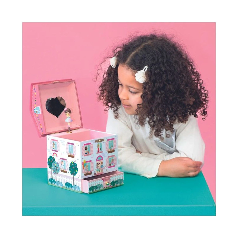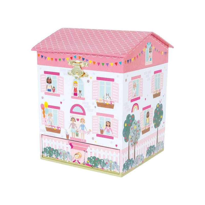Ozdobiona urokliwymi ilustracjami przedstawiającymi domek dla lalek. Nakręć kluczyk, a po otwarciu szkatułki zobaczysz uroczą lalkę wirującą przed lustrem w kształcie serduszka, podczas gdy pozytywka gra delikatną i przyjemną melodię. Szkatułka posiada przestronną komorę główną oraz poręczną szufladkę. Wykonana z dbałością o szczegóły, zapakowana w ozdobne pudełko, doskonale nadaje się na prezent dla dziewczynek.