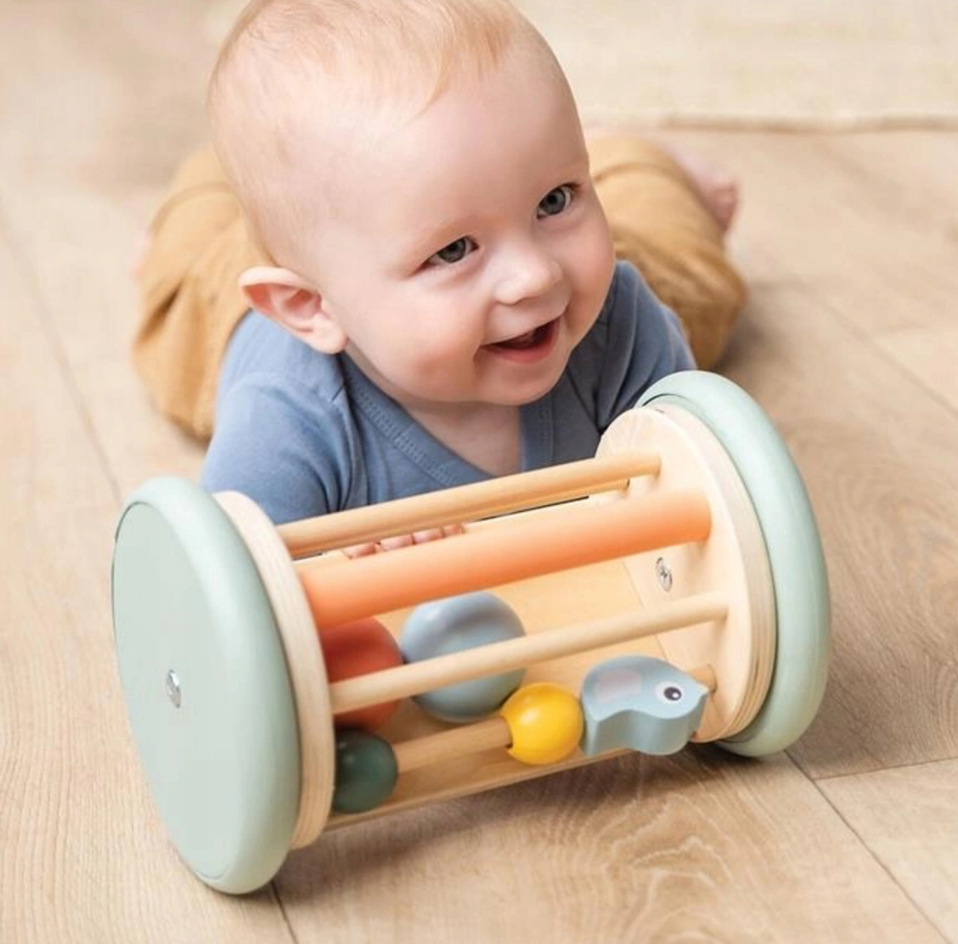 - Motywacja do raczkowania – zabawka toczy się po podłodze, zachęcając dziecko do podążania za nią.