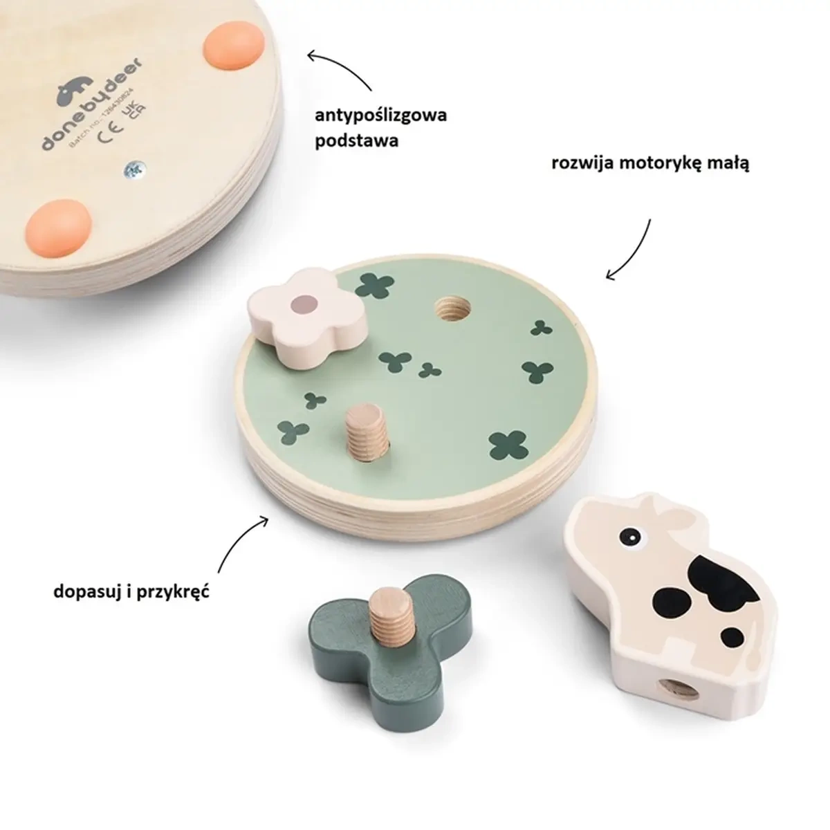 Zabawka typu „dopasuj i wkręć” z kolekcji Tiny Farm od Done by Deer to doskonała propozycja dla maluchów od 18. miesiąca życia, wspierająca rozwój motoryki, koncentracji i logicznego myślenia.