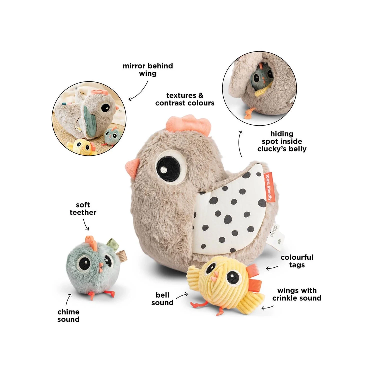 Odkrywanie świata jeszcze nigdy nie było tak fascynujące! Pluszak Done by Deer Hide & Seek Activity to przytulny kurczak pełen interaktywnych niespodzianek, który zachęca malucha do zabawy, odkrywania i ćwiczenia nowych umiejętności. Pod skrzydełkiem ukryte zostało bezpieczne lusterko, a w brzuszku czeka małe kurczątko, które można wyjmować i wkładać z powrotem – zabawa w „a kuku” gwarantowana!