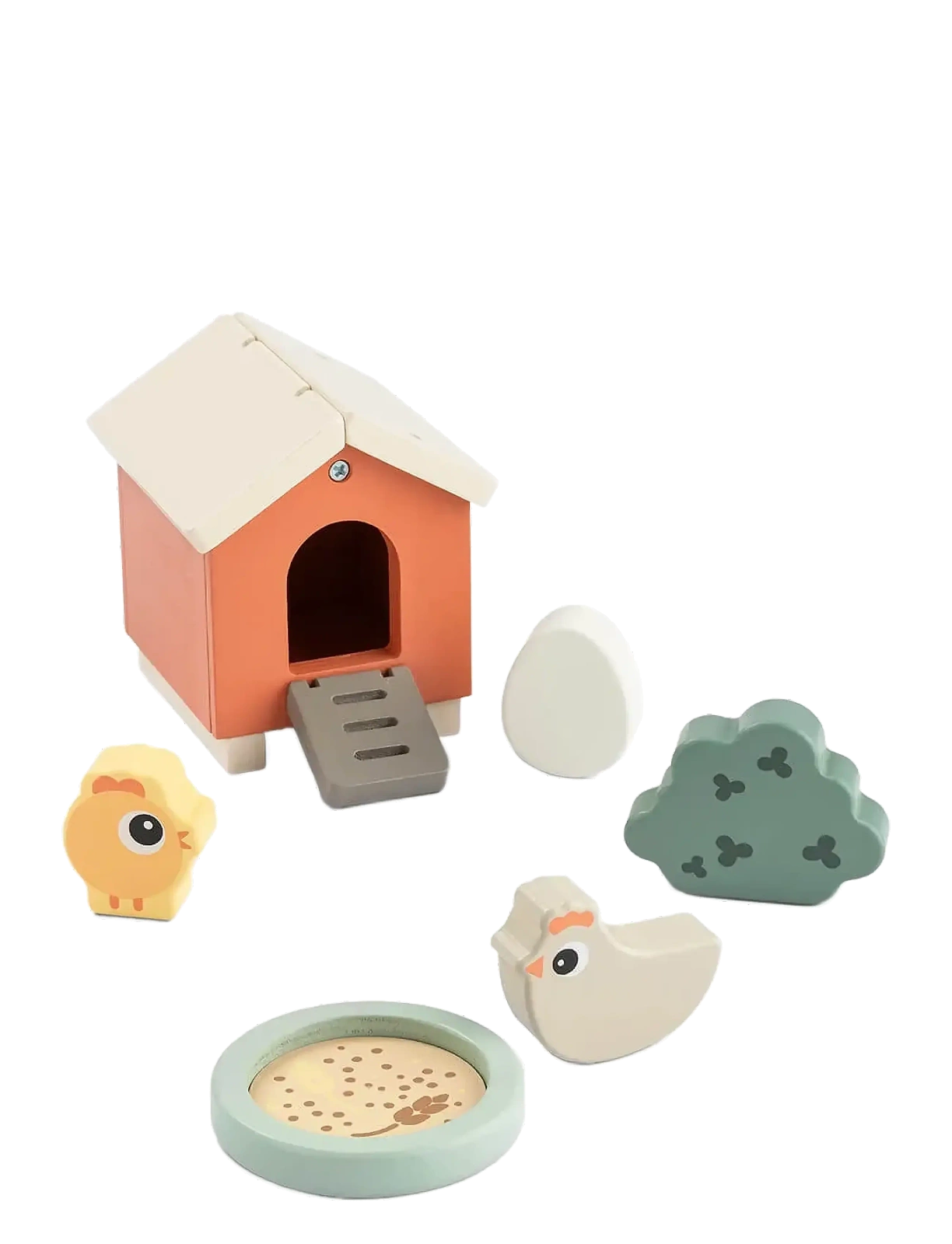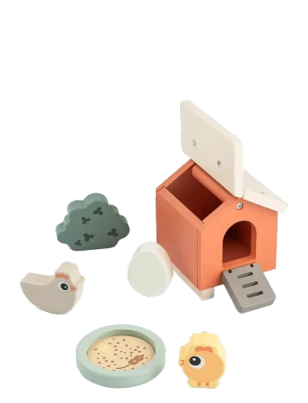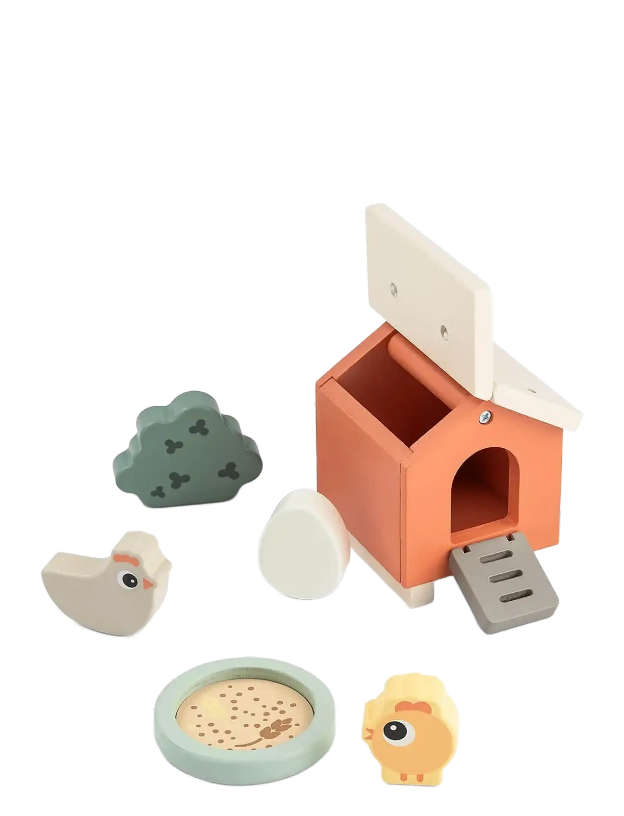 Dziecko może odgrywać własne przygody dzięki figurkom kury i pisklaka, rozwijając mowę, wyobraźnię oraz zdolności manualne. Całość została wykonana z drewna pochodzącego z odpowiedzialnych źródeł i pomalowana bezpiecznymi farbami na bazie wody.