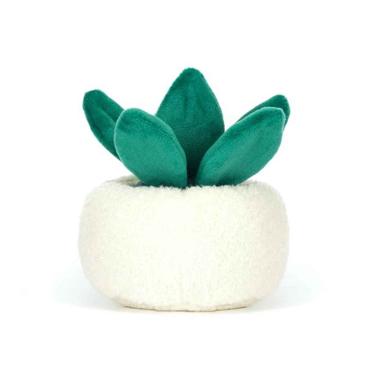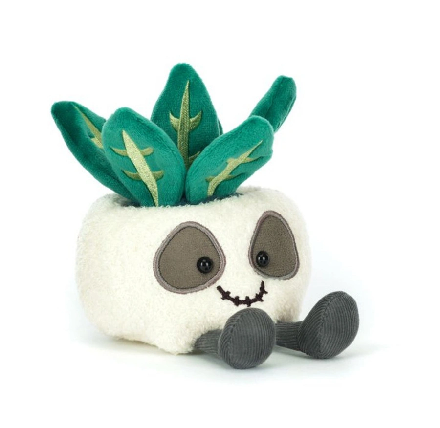Doniczka Halloweenowa od Jellycat to nietypowy pluszak, który łączy w sobie urok maskotki i zabawnej dekoracji. Ma kremowe, miękkie futerko, zielone listki przypominające kaktusa, szare stópki, błyszczące oczka i szeroki uśmiech, który od razu poprawia nastrój. Idealnie sprawdzi się zarówno jako przytulanka, jak i jako oryginalny element halloweenowych aranżacji.