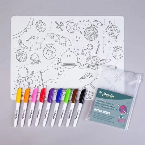 - Mata silikonowa do kolorowania Kosmos od HeyDoodle to idealna zabawka dla małych artystów, którzy chcą odkrywać tajemnice galaktyki i rozwijać swoje zdolności twórcze. Dzięki dużej powierzchni maty w formacie A3.
