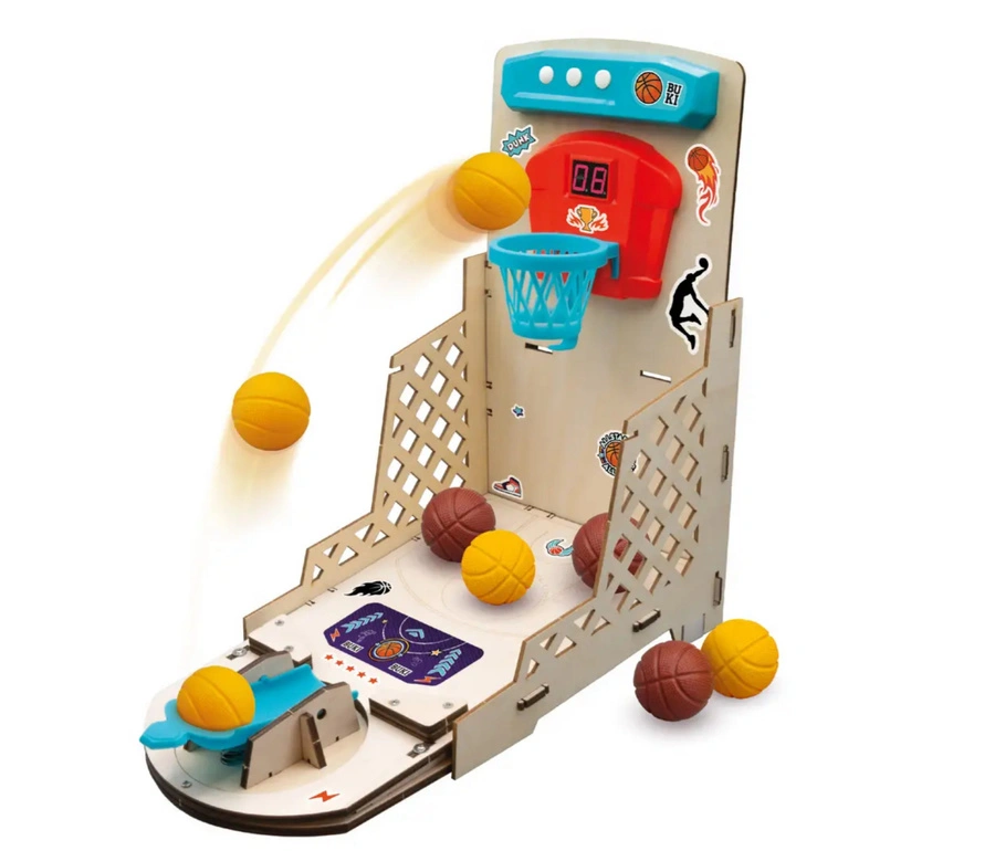 - Zbuduj własne elektroniczne mini boisko do koszykówki i odkryj, jak ekscytująca może być nauka poprzez zabawę! Ten kreatywny zestaw pozwala dzieciom samodzielnie złożyć działające boisko z elektroniczną tablicą wyników, która reaguje na każdy celny rzut.