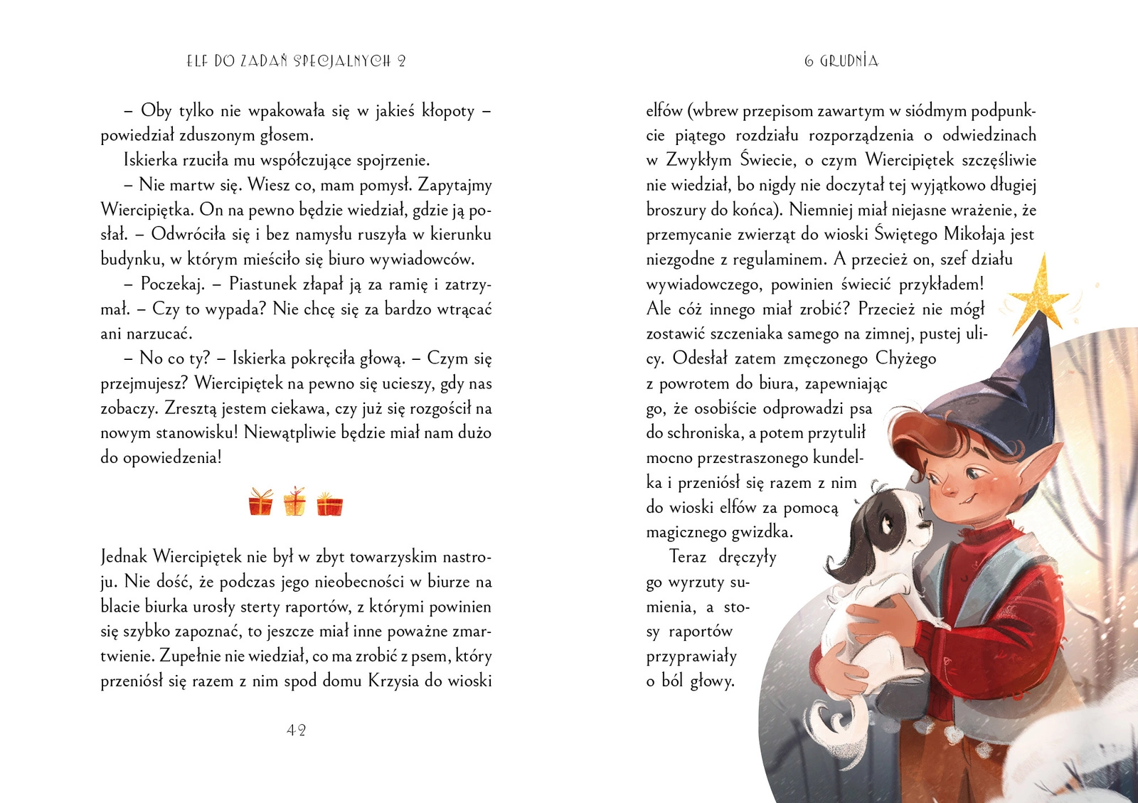 W tym przedświątecznym gwarze jeden elf nie potrafi cieszyć się tak jak reszta. Wiercipiętek właśnie został mianowany szefem działu wywiadu, jednak nowe stanowisko nie daje mu radości — najbardziej brakuje mu wypraw do świata ludzi. Wszystko zmienia się, gdy pojawia się nagłe zadanie: trzeba odnaleźć zaginionego szczeniaka pewnego chłopca oraz sprowadzić do wioski elfkę, która przypadkiem utknęła w Zwykłym Świecie.