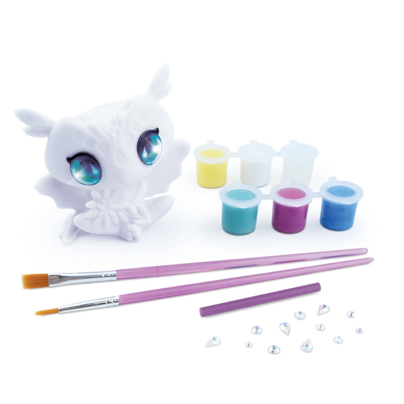 - Ten kreatywny zestaw pozwala dzieciom samodzielnie pomalować gipsową figurkę, udekorować ją brokatem i cyrkoniami, a następnie dodać do swojej kolekcji fantastycznych stworzeń z błyszczącymi oczami.