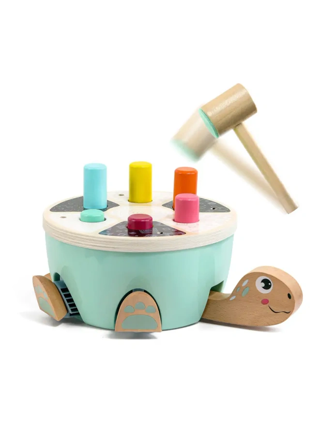 Młotek został zaprojektowany z myślą o wygodzie najmłodszych – jego kształt idealnie pasuje do małych rączek, a powierzchnia pokryta filcem skutecznie tłumi odgłosy uderzeń, co sprawia, że zabawa nie jest zbyt głośna. Kolorowa zabawka z wesołym motywem żółwia wspiera dzieci w nauce barw, a kontrastujące kolory, takie jak czerń i biel, wzbudzają ciekawość i zachęcają do dalszej zabawy.