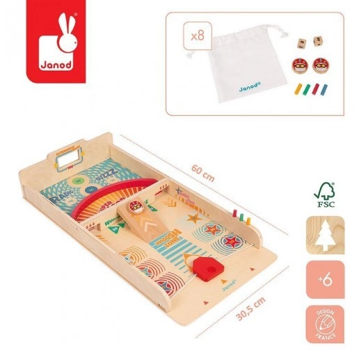 - Drewniana gra zręcznościowa od francuskiej marki JANOD to świetna zabawa dla dwóch graczy – dzieci lub dziecka i rodzica. Zadaniem graczy jest wystrzeliwanie krążków i trafianie nimi na punktowane pola, by zdobyć jak najwięcej punktów.