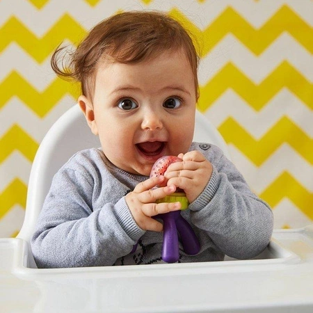 Miękki, silikonowy podajnik jest delikatny dla wrażliwych dziąseł malucha, a jednocześnie trwały i higieniczny. Dziecko może gryźć i ciamkać gryzak bez obaw, a ergonomiczna podstawa umożliwia mu swobodne operowanie nim. Co więcej, stabilna konstrukcja pozwala na postawienie gryzaka na blacie, dzięki czemu jedzenie jest zawsze w zasięgu ręki dziecka. Poręczny pierścień umożliwia łatwe zamontowanie i zdemontowanie silikonowej nasadki, a dołączona pokrywka pozwala na przechowywanie gryzaka w higienicznych warunkach.