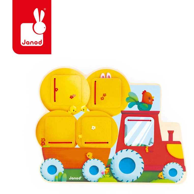 Design w kształcie traktora: Zabawka ma formę traktora z przyczepą pełną siana, w której ukryte są różne zwierzątka gospodarskie, takie jak kotek, myszki, kurka i inne. Dzieci odkrywają je poprzez otwieranie drewnianych okienek, co rozwija umiejętności manualne oraz logiczne myślenie.