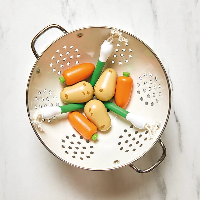 18 drewnianych owoców i warzyw: 3 marchewki, 3 ziemniaki, 3 pory, 3 jabłka, 3 gruszki, 3 truskawki