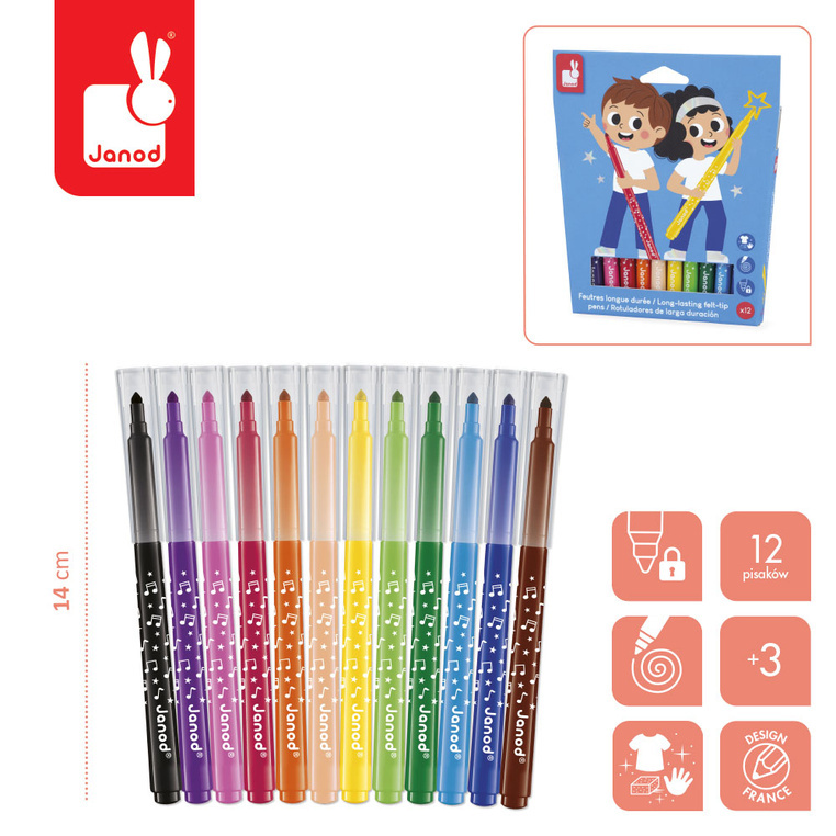 - Zestaw 12 flamastrów z kolekcji COLO francuskiej marki Janod został stworzony z myślą o dzieciach, które z pasją odkrywają świat kolorów.