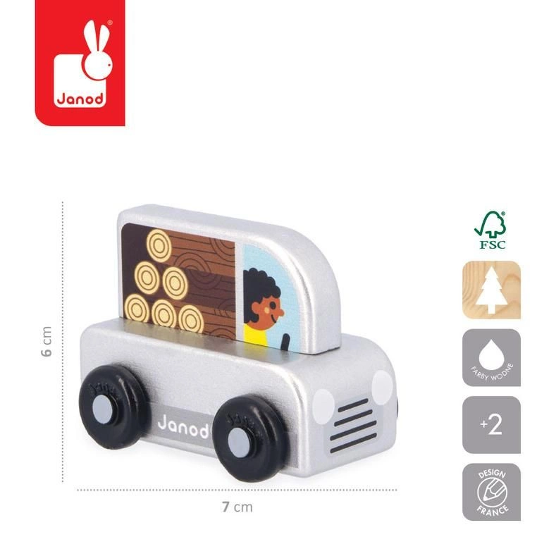 Samochód terenowy typu pick-up z serii Cross Roads francuskiej marki JANOD to doskonałe uzupełnienie maty-dywanu do zabawy z drogą Wieś z tej samej kolekcji. Pojazd wykonany jest z drewna, posiada poręczne kształty dopasowane do małych rączek, szary kolor, a dzięki kółkom łatwo porusza się po różnych powierzchniach. W środku znajduje się uśmiechnięty rolnik wiozący bele drewna, co zachęca malucha do snucia własnych historii i kreatywnej zabawy.