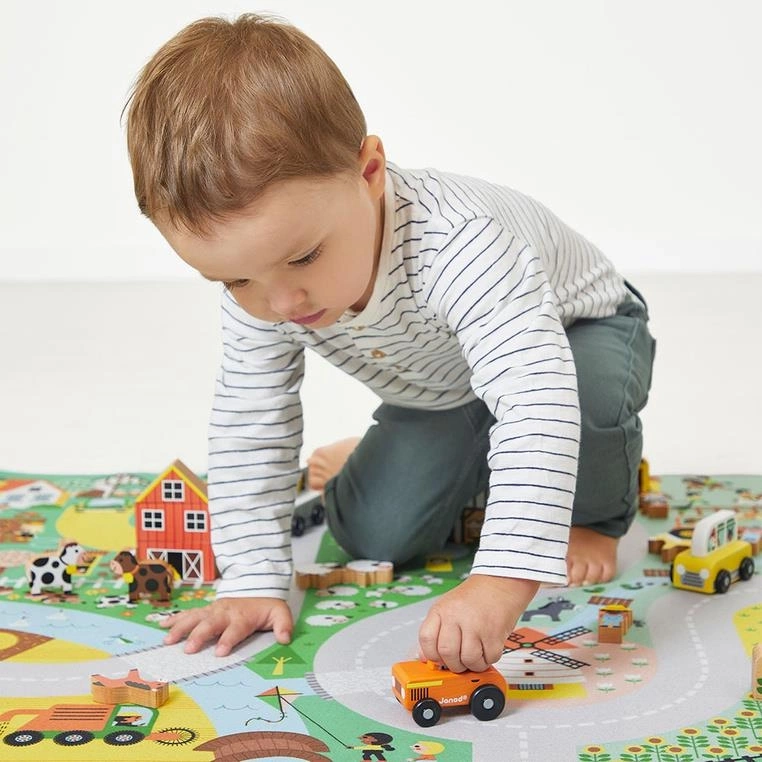 Traktor z serii Cross Roads francuskiej marki JANOD to doskonałe uzupełnienie maty-dywanu do zabawy z drogą Wieś z tej samej kolekcji. Pojazd wykonany jest z drewna, posiada poręczne kształty dopasowane do małych rączek, czerwony kolor, a dzięki kółkom łatwo porusza się po różnych powierzchniach. W środku znajduje się uśmiechnięta rolniczka, co zachęca malucha do snucia własnych historii i kreatywnej zabawy.