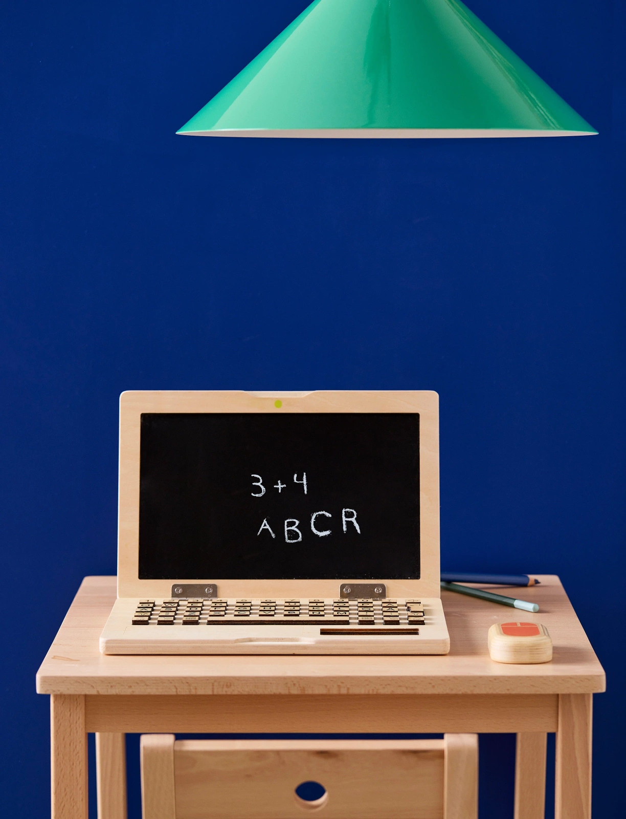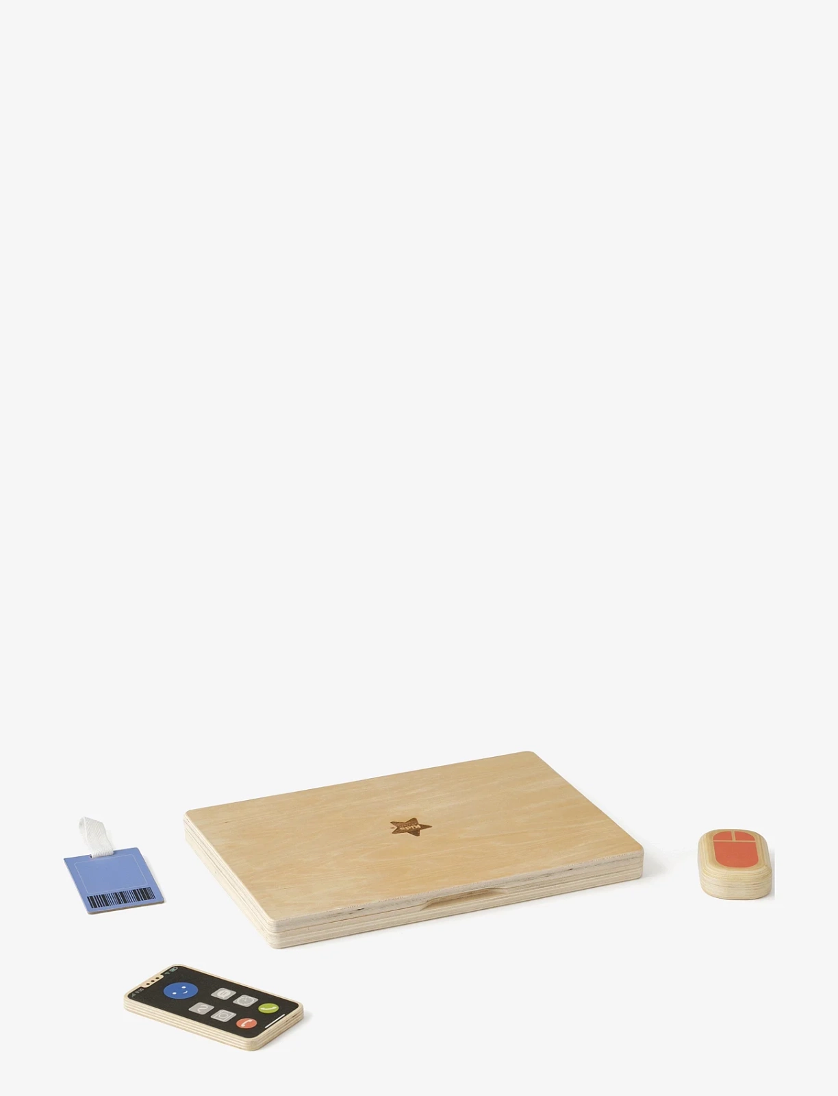 Drewniany laptop ma składana konstrukcję i naciskane klawisze, które dodają zabawie interaktywności. Kolorowa myszka, telefon oraz karta wstępu sprawiają, że całość wygląda jak prawdziwe stanowisko pracy. Ekran komputera pełni rolę tablicy kredowej, na której można pisać i rysować (kreda nie jest dołączona).