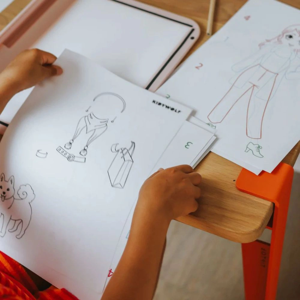 Tablica oferuje dwie wyjątkowe powierzchnie do twórczej zabawy. Pierwsza to neonowa powierzchnia kredowa, która pozwala rysować jasnymi, intensywnymi kolorami, które efektownie świecą w ciemności – idealne do eksperymentowania z kształtami, literami i rysunkami. Druga funkcja to system naklejek do tworzenia sylwetek, strojów i dodatków, dający możliwość komponowania własnych projektów – ponad 1000 kombinacji jak w prawdziwym studiu mody!