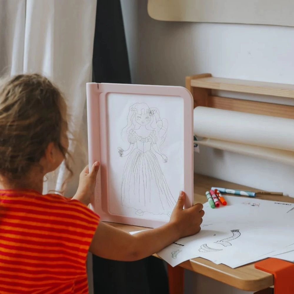 Miękkie, regulowane światło LED dba o oczy dziecka, zapewniając komfort zabawy niezależnie od pory dnia. Dzięki lekkiej i kompaktowej konstrukcji tablicę można łatwo zabrać wszędzie – do domu, w podróż, do dziadków czy na wakacje.