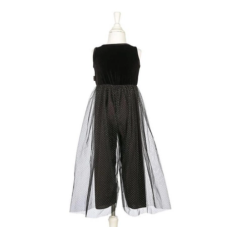 Szerokie, czarne spodnie z delikatnym wzorem w małe kropeczki. Warstwa szerokiego tiulu na spodniach nadająca lekkości i wyjątkowego charakteru. Miękki i komfortowy materiał przyjazny dla skóry dziecka. Idealny na bale przebierańców, Halloween, Sylwestra i inne tematyczne okazje. Doskonały pomysł na prezent dla każdej dziewczynki