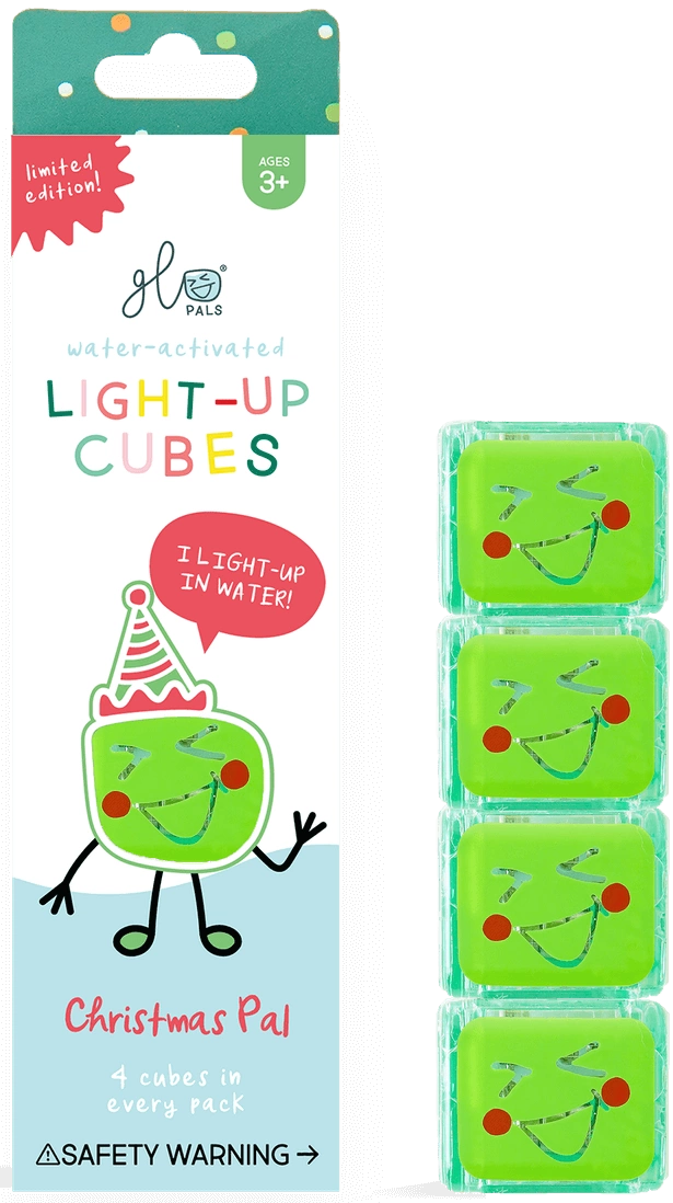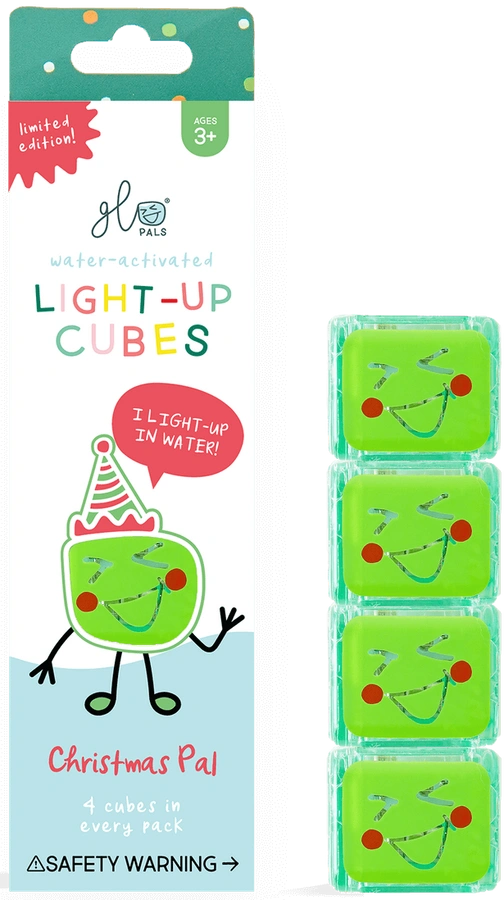 - 4 zielone kostki sensoryczne Glo Pals, które świecą w wodzie.