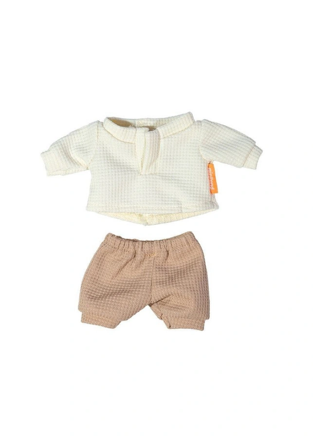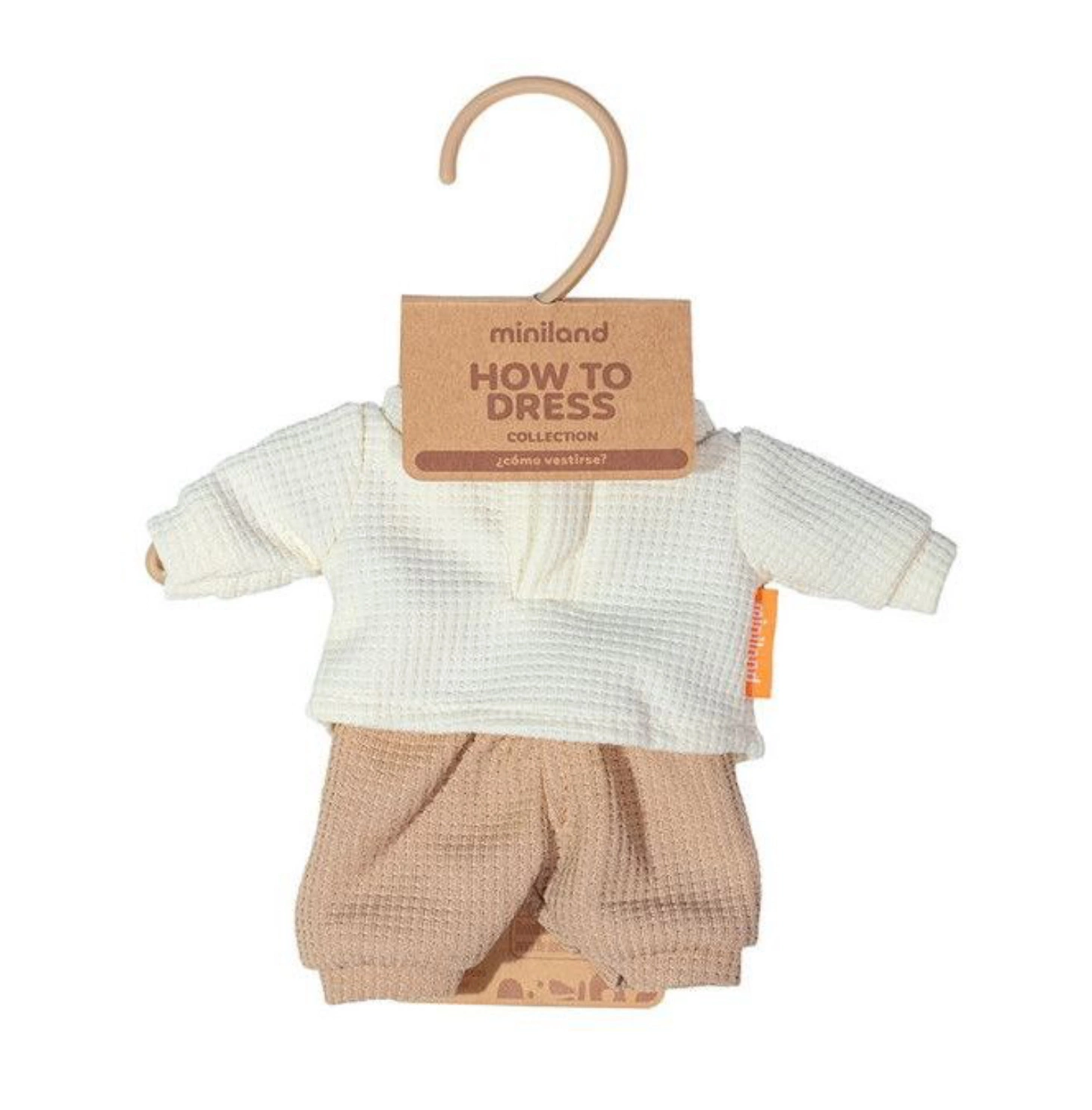 - Ten zestaw odzieżowy dla lalek Miniland o wysokości 21 cm składa się z kremowej koszulki i wygodnych spodni – idealny na letnie dni i łagodną pogodę
