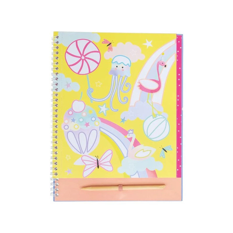 Odklej białą naklejkę, wybierz jeden z kolorowych arkuszy folii i użyj drewnianego rysika, aby przenieść folię na naklejkę i stworzyć wspaniałe obrazki! Zestaw zawiera 20 różnorodnych arkuszy foliowych, 8 pięknych stron z motywem tęczowych wróżek oraz drewniany rysik – wszystko w poręcznej książeczce z spiralnym grzbietem, która jest idealna do zabrania wszędzie.