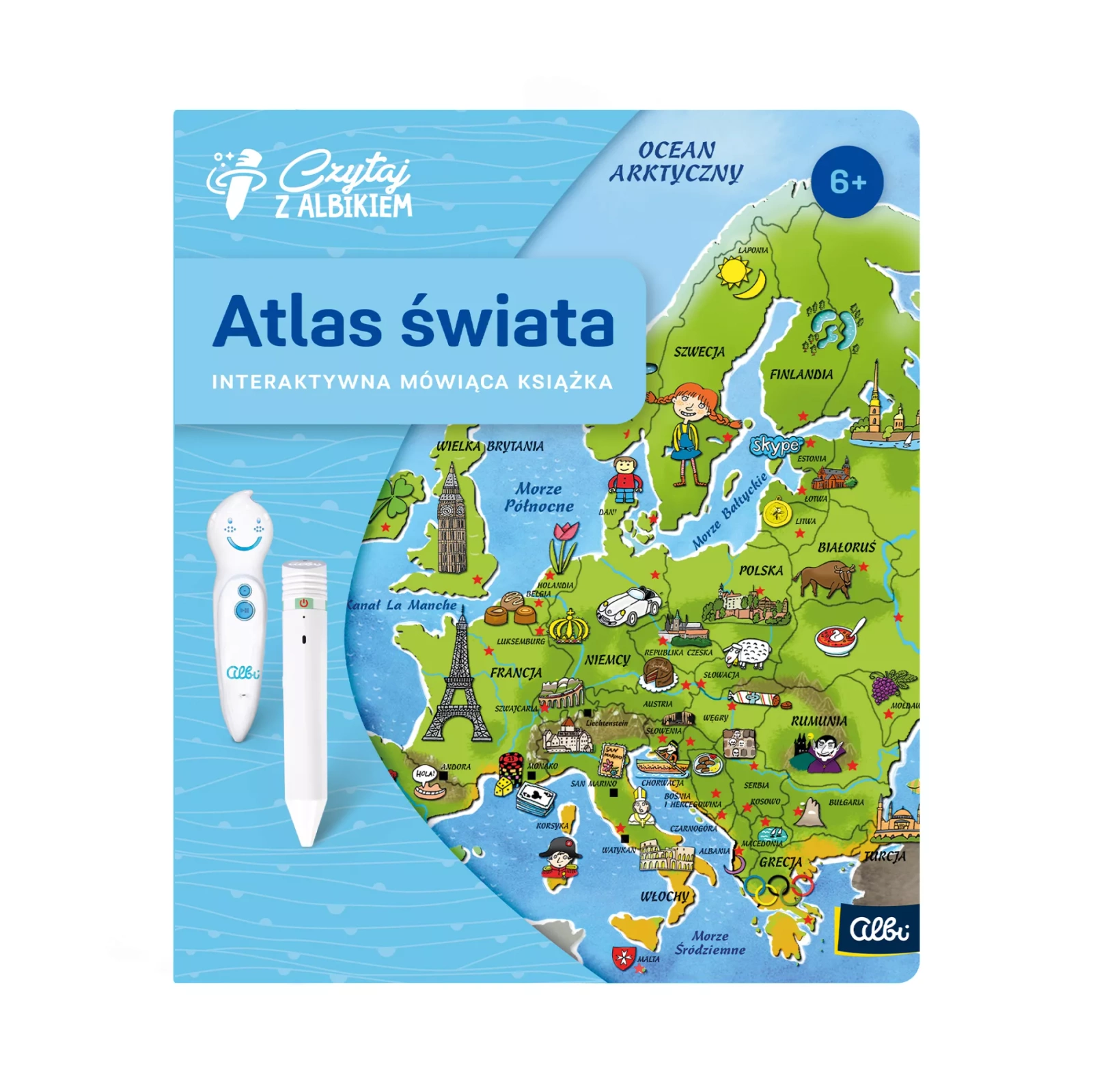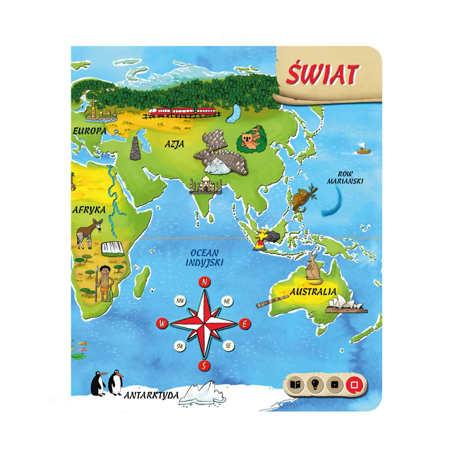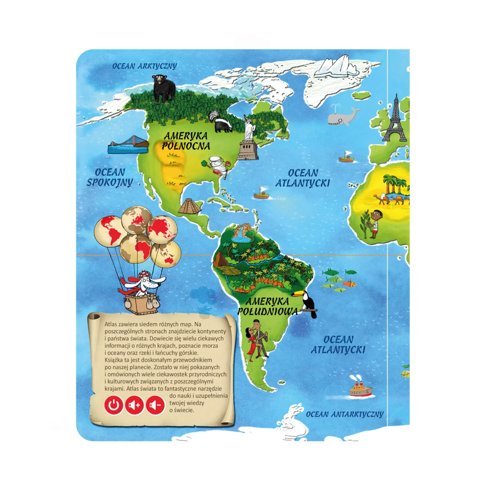- Odkryj piękno naszej planety z "Atlasem świata"! Poznaj kontynenty, kraje, ich stolice, a także oceany, rzeki i quizy. Książka zawiera prawie 1800 dźwięków i tekstów.