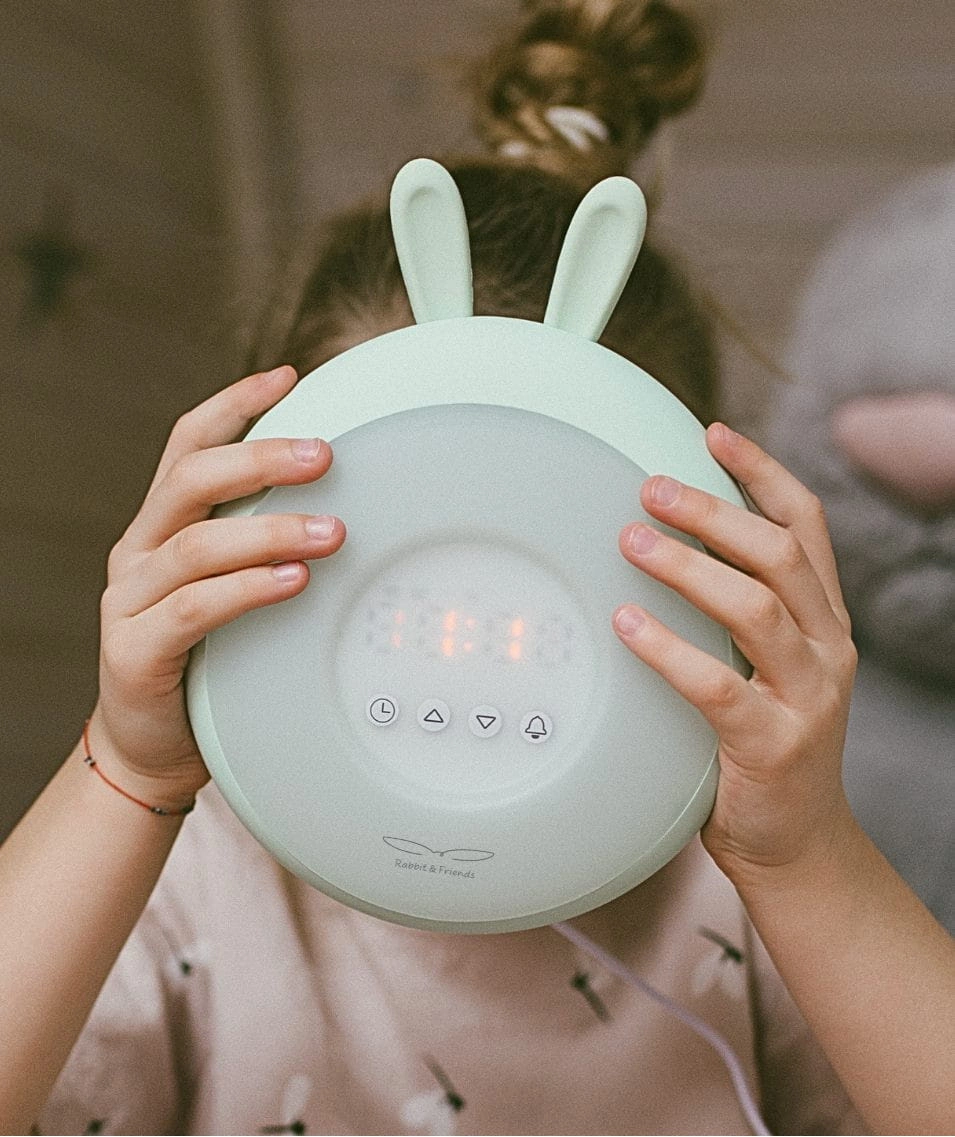 - Lampka Królik budzi łagodnym światłem i dźwiękami natury. Posiada funkcję wschodu i zachodu słońca, budzik, 5 melodii i panel dotykowy. Wymaga stałego podłączenia do prądu.