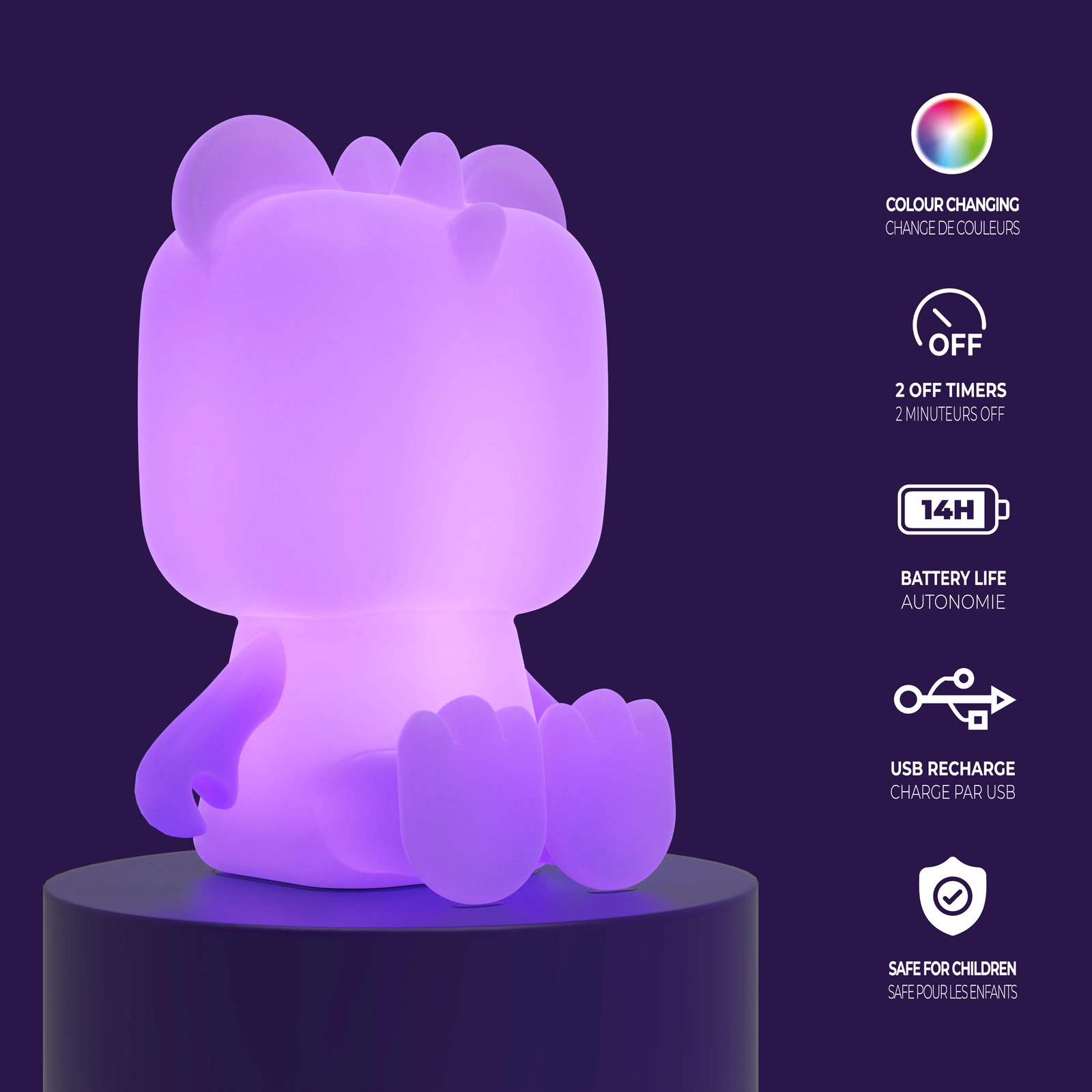 Miękka w dotyku i bezpieczna, zapewni maluchowi komfortowy sen bez strachu przed ciemnością. ładuj lampkę za pomocą kabla USB-C i ciesz się długimi godzinami przyjemnego światła!