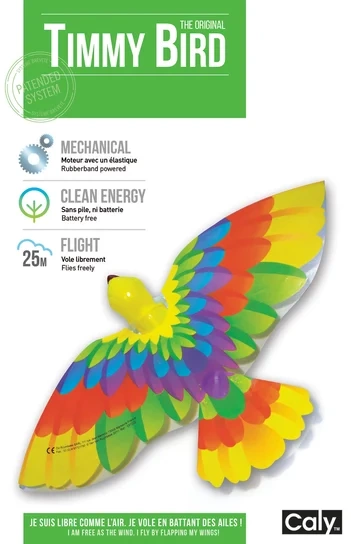 Nie potrzebuję baterii – wystarczy nakręcić mnie 50 razy za pomocą korbki, by wprawić moje skrzydła w ruch. Wbudowana gumka napędza lot, a elastyczne, odporne na rozerwanie skrzydła oraz regulowany ogon pozwalają eksperymentować z różnymi technikami i długością lotu.