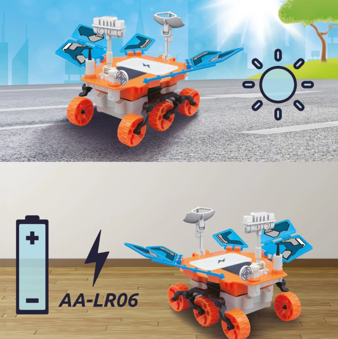 Łazik marsjański BUKI to niezwykła zabawka edukacyjna, która łączy budowanie, eksperymentowanie i odkrywanie. Dziecko samodzielnie składa model łazika, a następnie wprawia go w ruch dzięki energii słonecznej lub baterii. To gwarancja zabawy niezależnie od pogody!